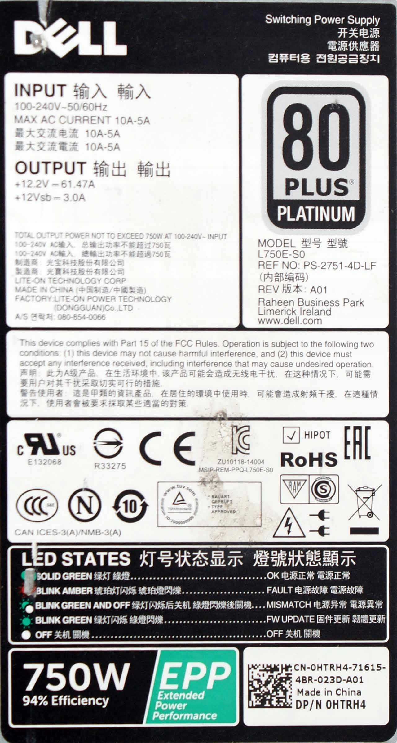 Dell L750E-S0 750 Вт 0HTRH4 для R530 R630 R730 R730XD R930 T430 T630