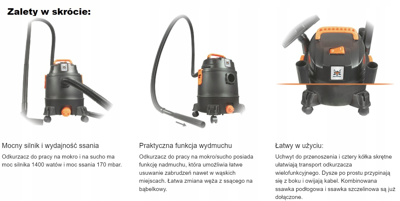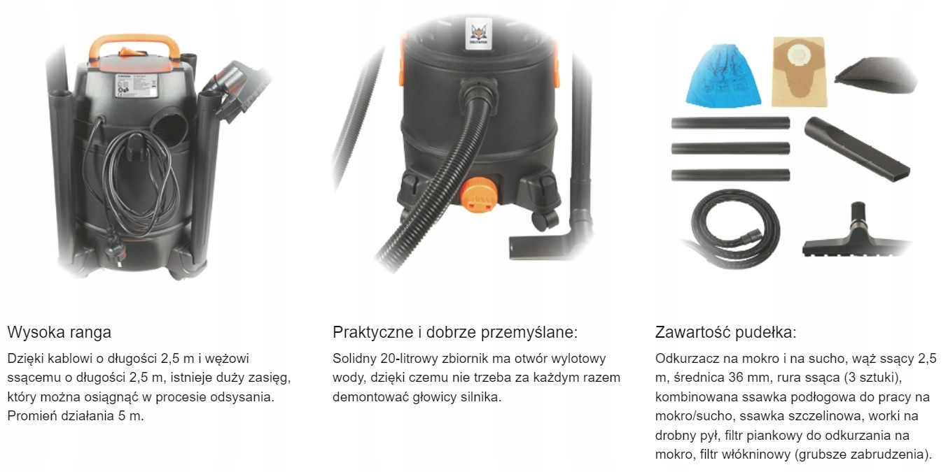 Электрический пылесос для сухой и влажной уборки Deltafox DC-WDE 1420 P — это эффективный универсальный пылесос с двигателем мощностью 1400 Вт и мощностью всасывания 17 кПа. Его контейнер вмещает 20 литров грязи или воды. Множество полезных деталей, таких как функция обдува, ручка для переноски, отверстия для крепления аксессуаров или пробка для слива воды, делают его практичным помощником при чистке. В комплект входят все необходимые фильтры, мешочки и две практичные насадки. Большой рабочий диапазон благодаря кабелю длиной 2,5 м и шлангу длиной 2,5 м.