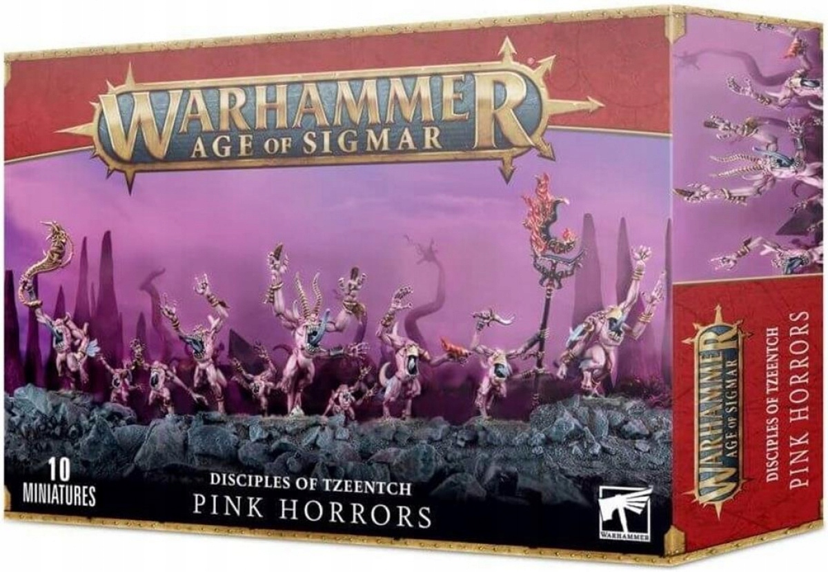 В этот набор входят пластиковые Розовые Ужасы, состоящие из нескольких частей и конечностей. В этот набор входят все компоненты, необходимые для сборки трубача, икононосца (с огромной пылающей иконой Тзинча) и радужного ужаса, чемпиона, который радостно раздает смерть своими цепкими руками.