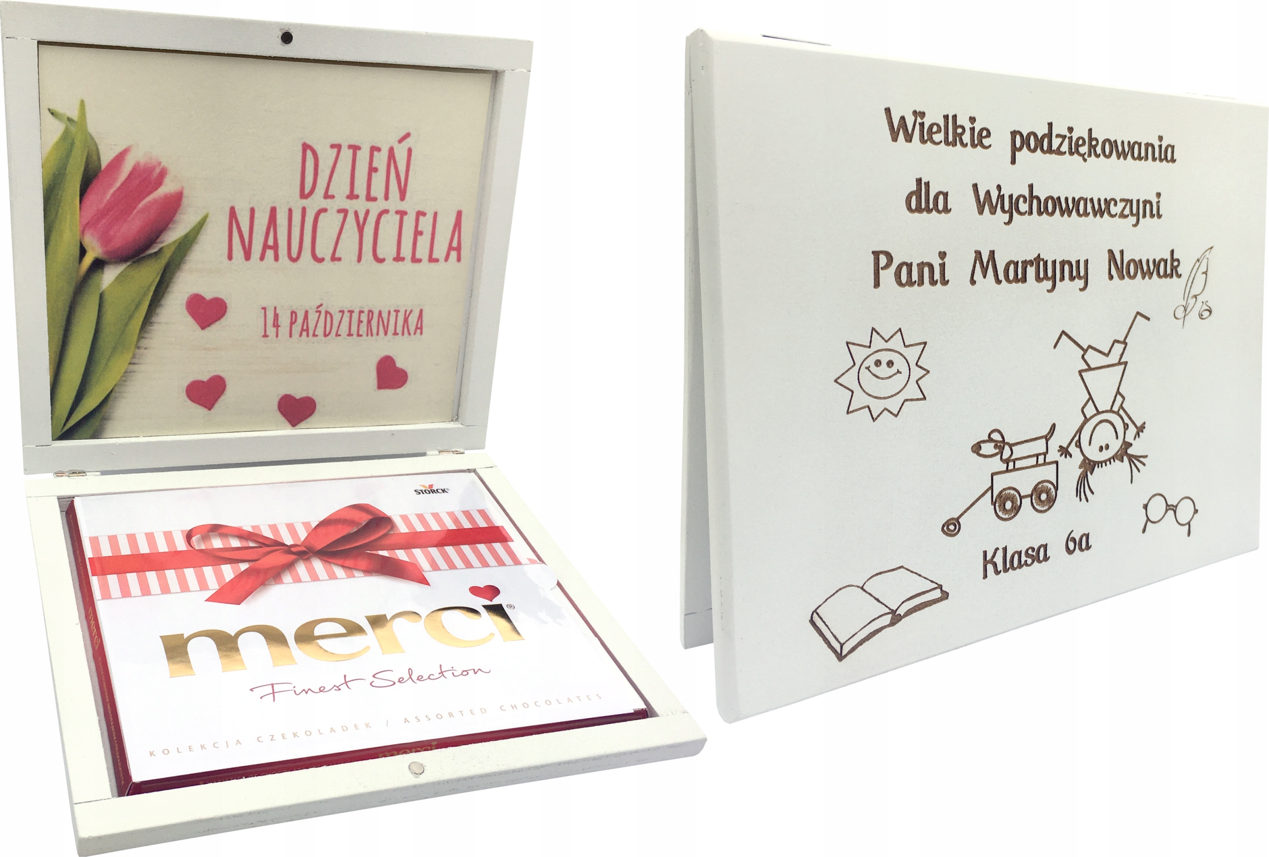 ДЕРЕВЯННАЯ КОРОБКА ДЛЯ ШОКОЛАДА MERCI С ГРАВИРОВКОЙ НА ДЕНЬ УЧИТЕЛЯ