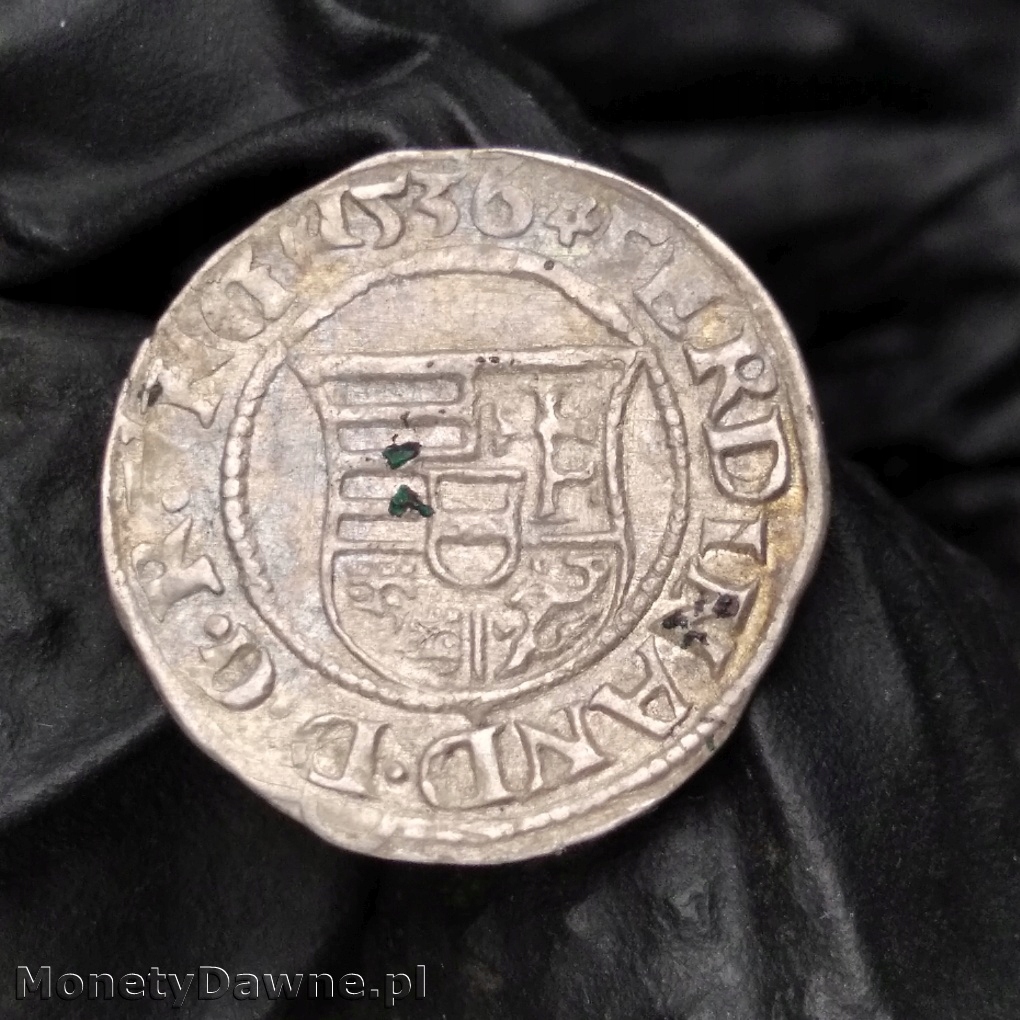 Денар 1536, Фердинанд I, Венгрия; Герб, вдоль обода Фердинанда. Очень красиво сохраненная монета с глянцевым фоном и тонкой патиной.