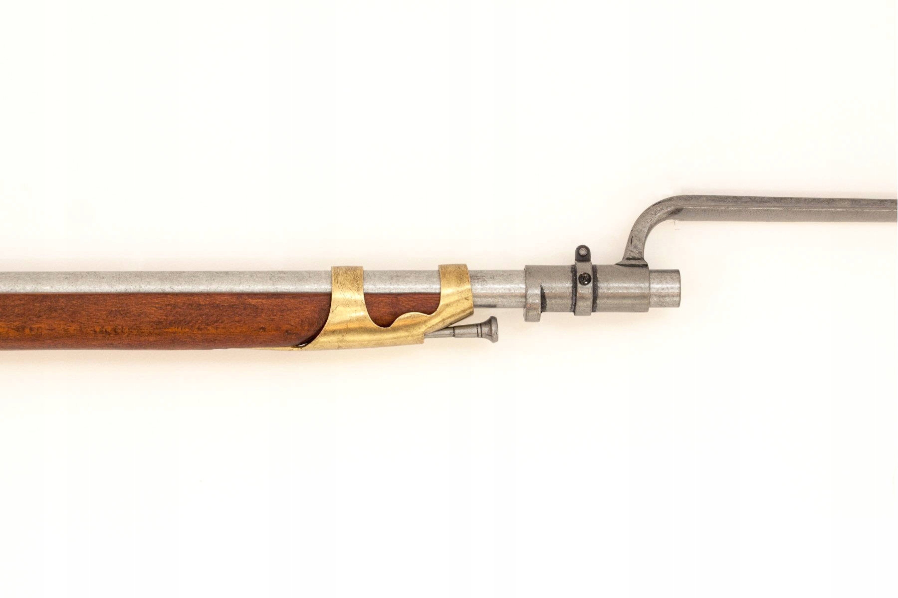 Замечательная копия наполеоновского мушкета со съемным штыком 1806 года от известной компании Denix. Реплика не содержит каких-либо существенных частей оружия, а переделать ее в огнестрельное невозможно, поэтому она полностью безопасна и легальна, не требует регистрации или разрешения. При помощи штыка создается модуль длиной 183 сантиметра, занимающий большую площадь стены, либо на соответствующей подставке он отлично смотрится на камине или комоде. Кран затягивается и происходит так называемое холостой выстрел. Металлические элементы отделки и ствол отлиты из цинкового сплава.