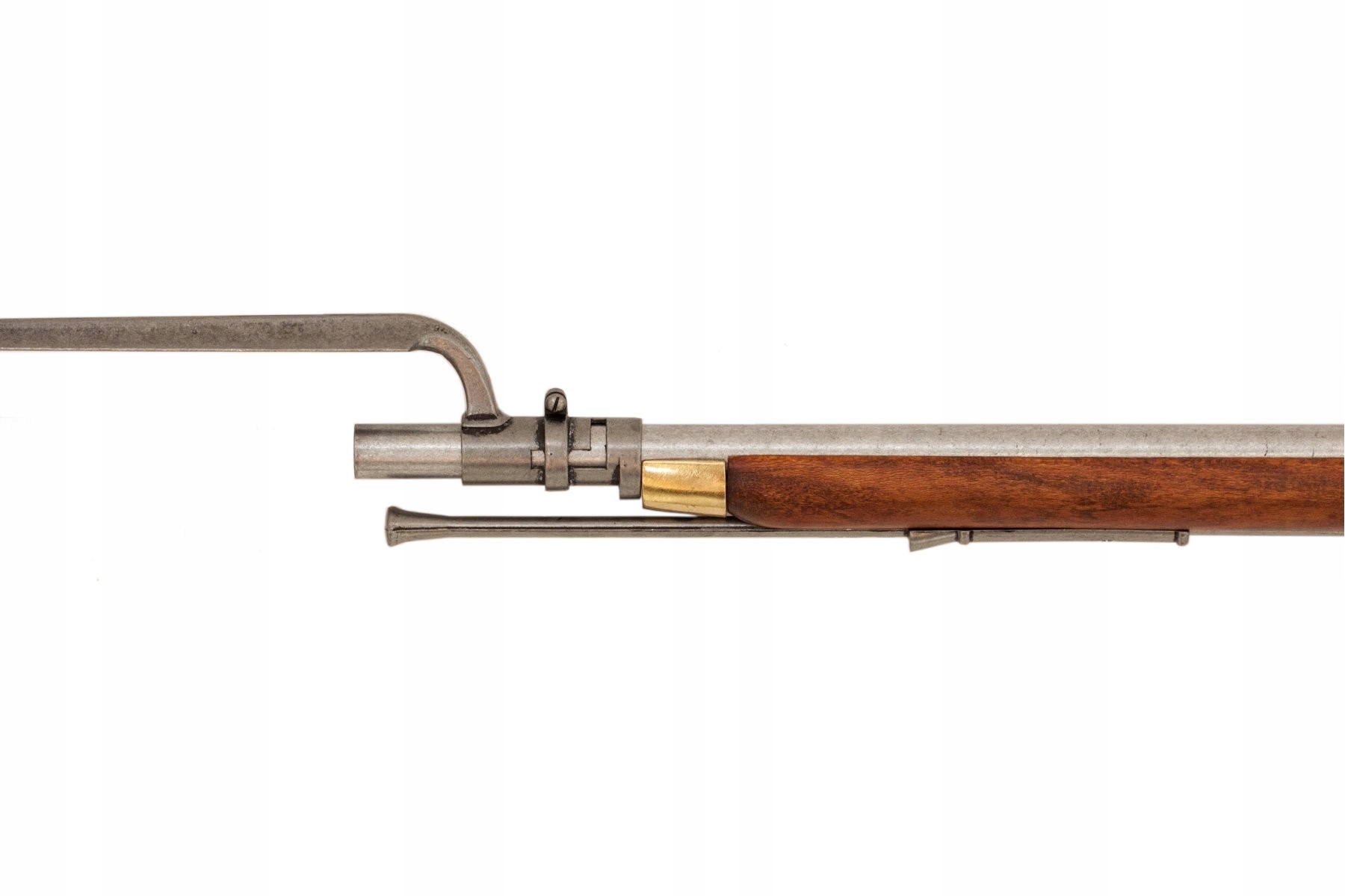Замечательная копия английского мушкета, официально называемого Short Land Pattern Muskett, от известной компании Denix. Реплика не содержит каких-либо существенных частей оружия, а переделать ее в огнестрельное невозможно, поэтому она полностью безопасна и легальна, не требует регистрации или разрешения. Реплика из дерева и металла, с механизмами заряжания и стрельбы. Кран затягивается и происходит так называемое холостой выстрел. Металлические элементы отделки и ствол - отлиты из цинкового сплава.
