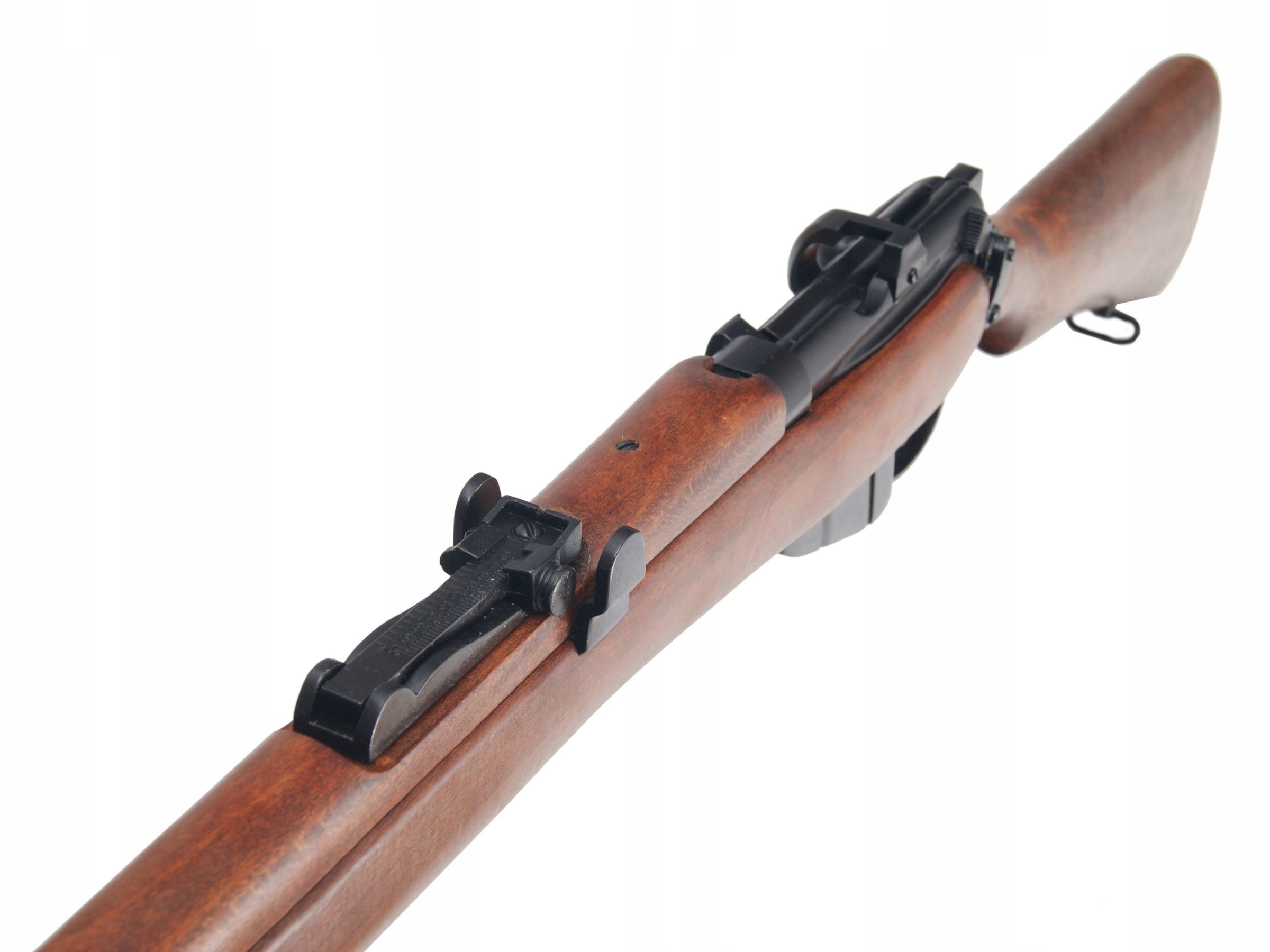 Металлическая копия британской винтовки с продольно-скользящим затвором Lee Enfield MK III. Короткий магазин Lee Enfield – также использовался ВС Польши на Западе. Реплика из металла и дерева. Он не содержит каких-либо важных частей оружия, поэтому полностью безопасен. Вы можете вернуть так называемую холостой выстрел. Функциональные элементы - затвор и спусковой крючок подвижны, можно перезаряжать и стрелять всухую.