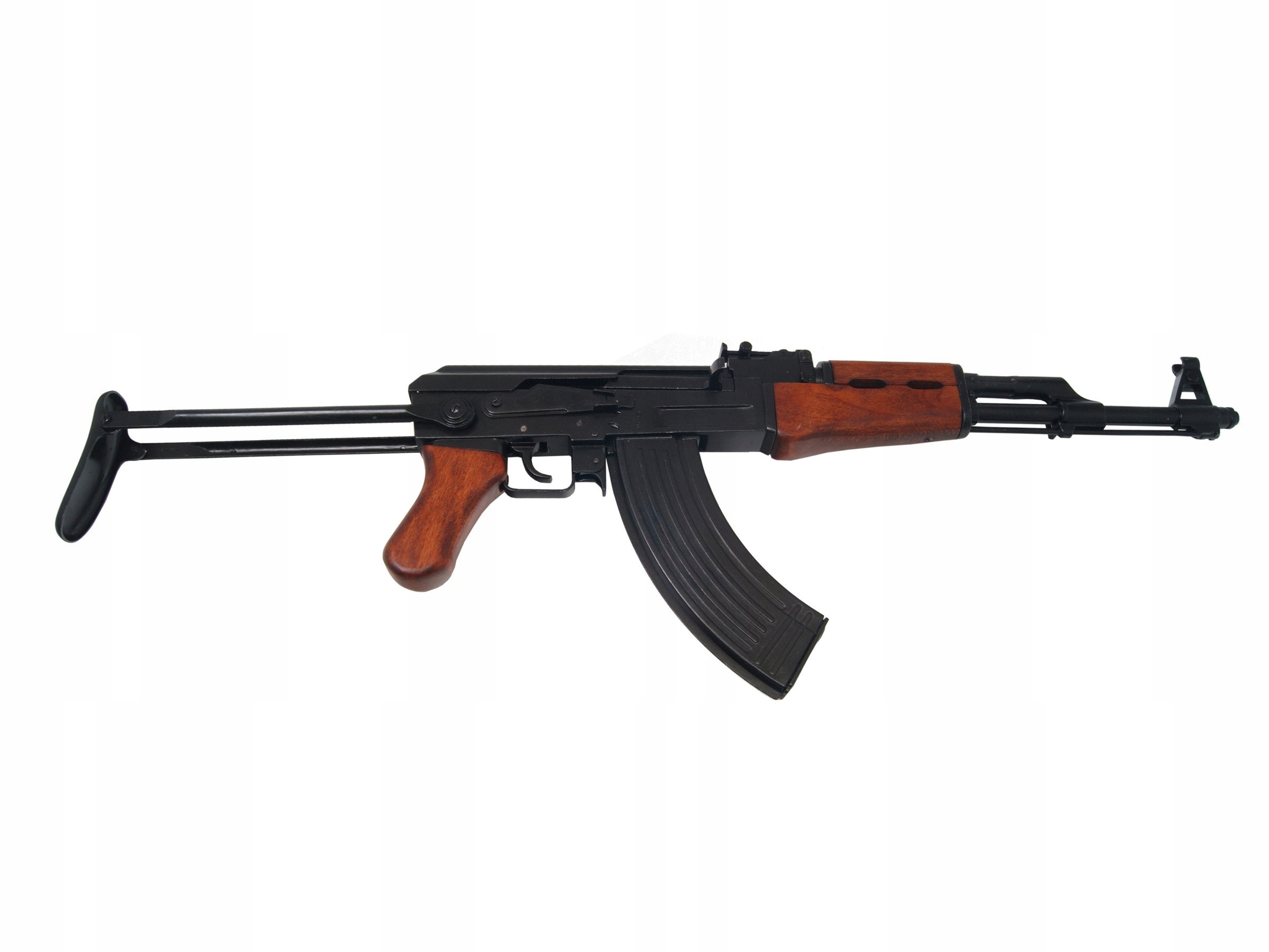 Металлическая копия советского автомата АК-47 производства известной компании Denix. Изготовлен из металла и дерева. Реплика не содержит каких-либо существенных частей оружия, и ее невозможно переделать в огнестрельное оружие, поэтому она полностью безопасна и легальна, не требует регистрации или разрешения. Приклад складной, можно снять магазин и произвести сухой выстрел.