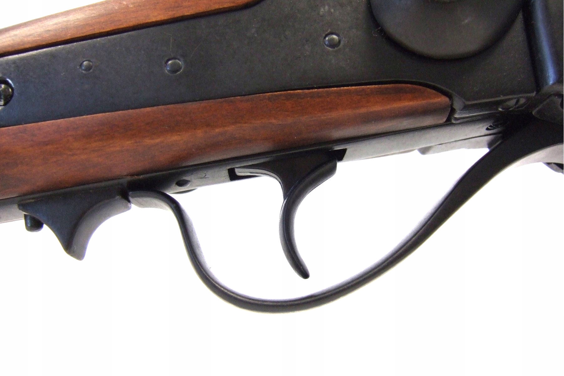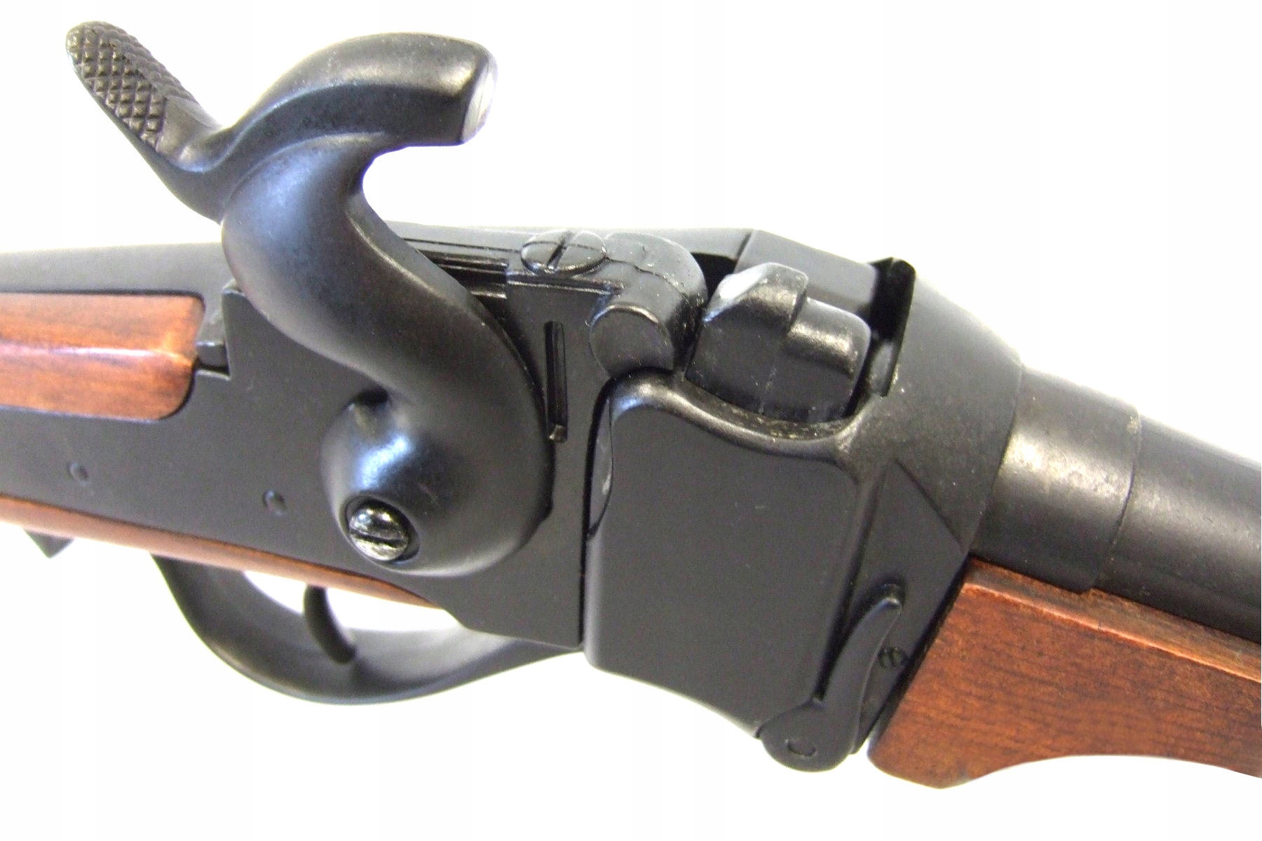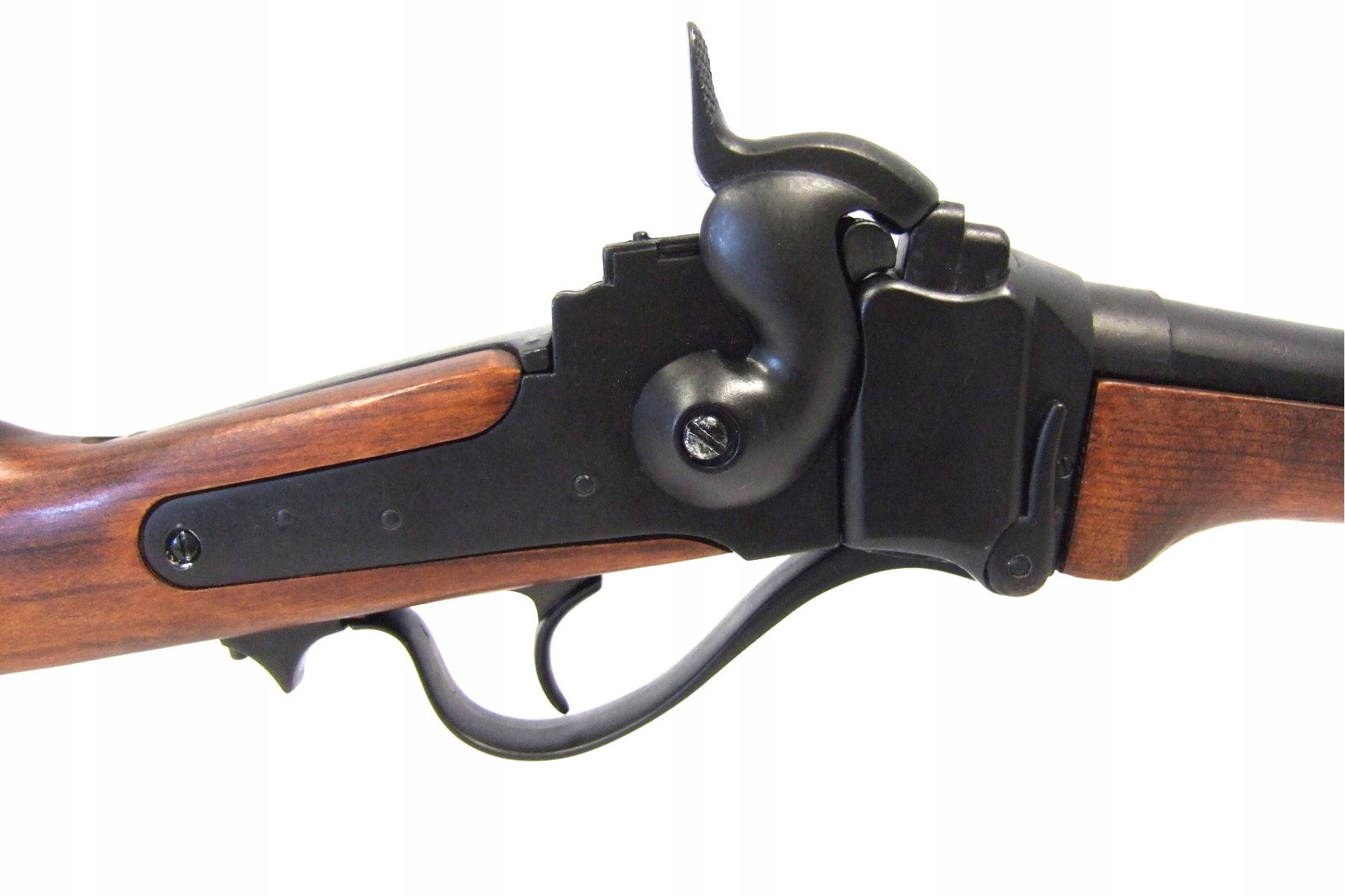 Металлическая копия американской военной винтовки Sharps 1859 года производства известной компании Denix. Реплика не содержит каких-либо существенных частей оружия, и ее невозможно переделать в огнестрельное оружие, поэтому она полностью безопасна и легальна, не требует регистрации или разрешения. Изготовлен из ZnAl – сплава цинка, алюминия и дерева. Можно перегрузить и вернуть так называемый холостой выстрел. Эта модель была одной из снайперских винтовок своего времени и использовалась на Диком Западе.