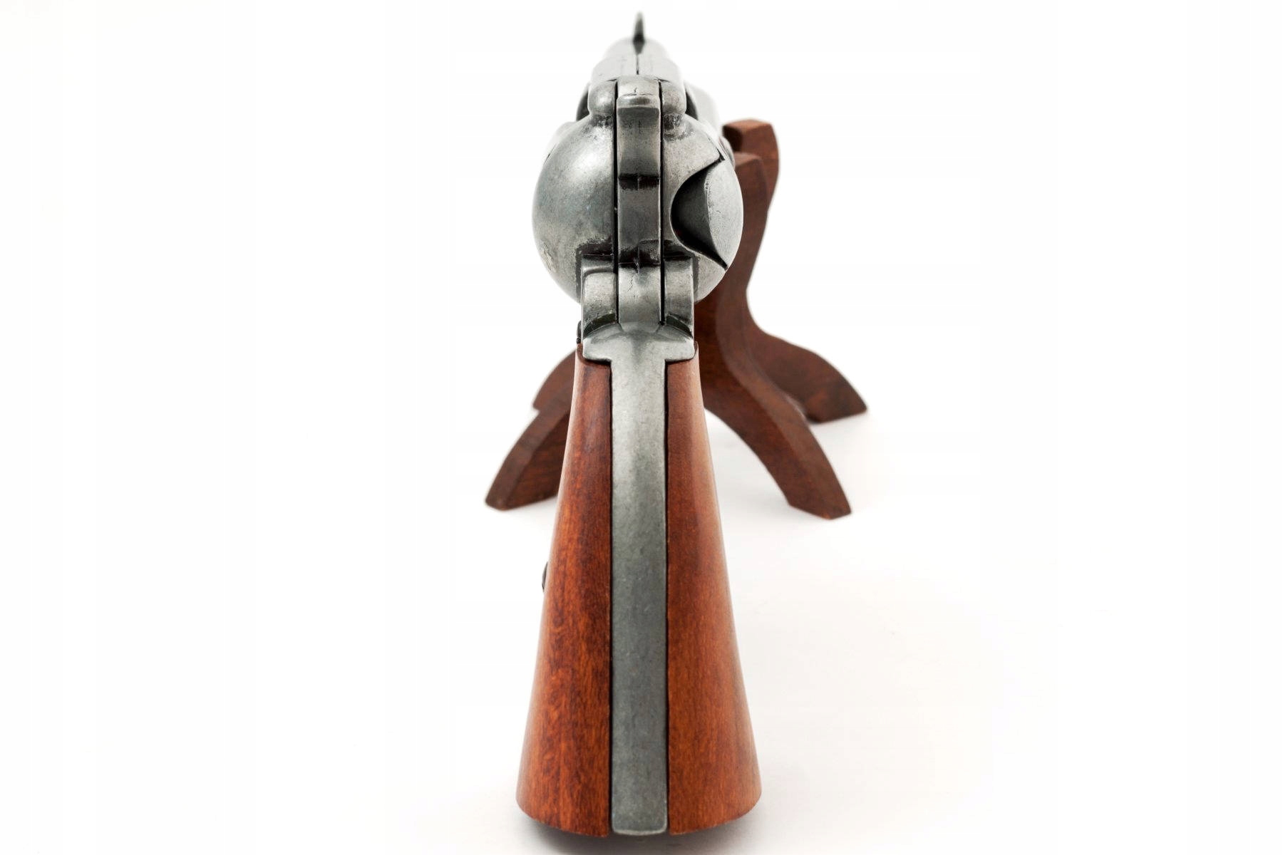 Реплика револьвера «Миротворец» 45 калибра известной компании Denix. Реплика не содержит каких-либо существенных частей оружия, а переделать ее в огнестрельное невозможно, поэтому она полностью безопасна и легальна, не требует регистрации или разрешения. Он изготовлен из полированного дерева и металла. Механизм, оснащенный подвижным спусковым крючком и краном, позволяет стрелять так называемыми холостой выстрел. Представленный револьвер продается без дополнительных аксессуаров: коробки и подставки.