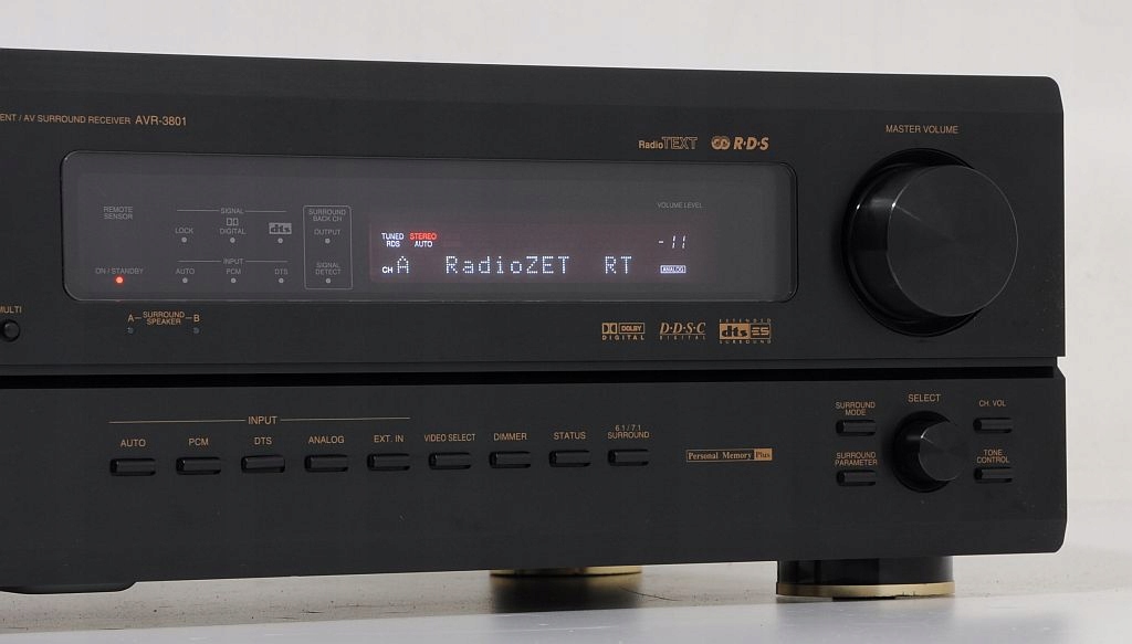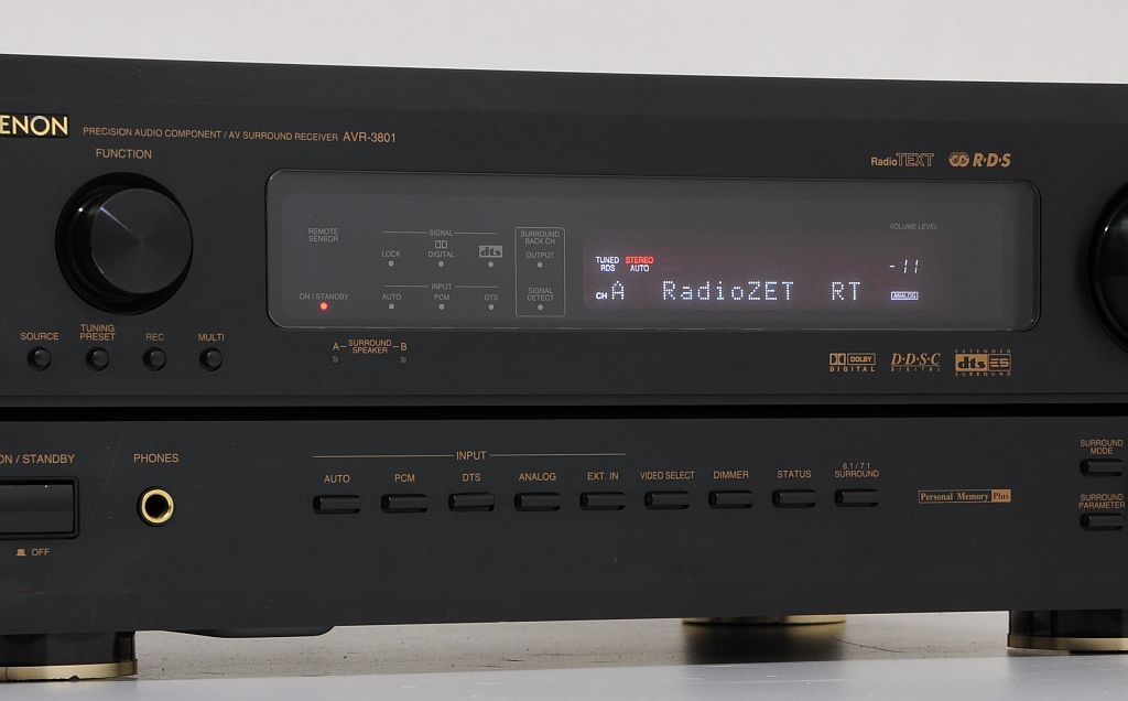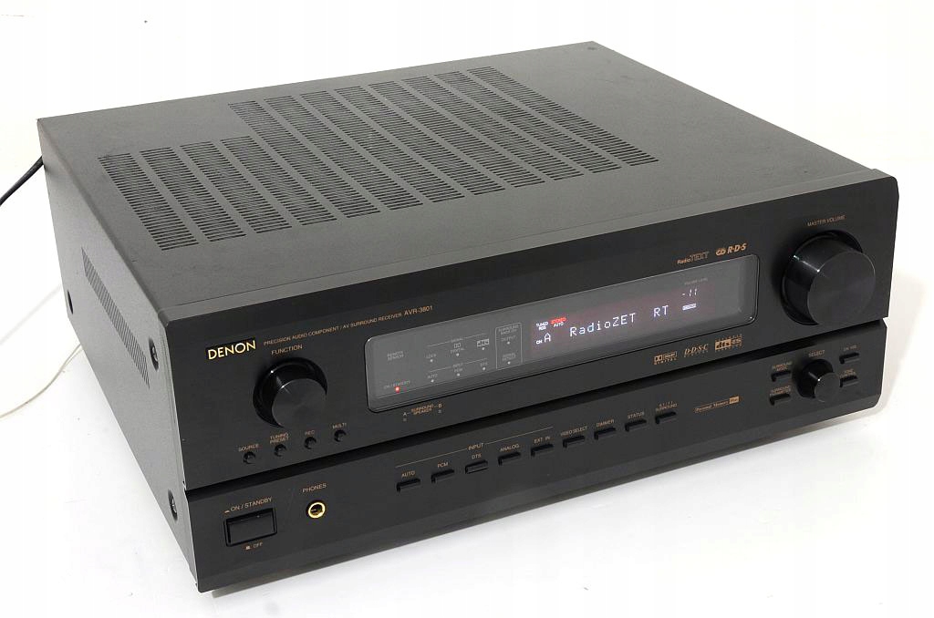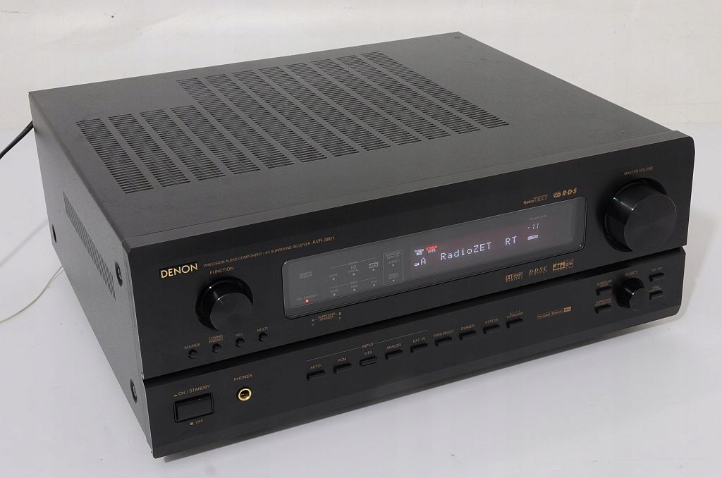 Это очень высокая модель ресивера DENON лучших лет его славы. Сделано в японии. AVR-3801 оснащен 7 насадками мощностью по 150 Вт каждая. Причем они изготовлены из твердотельных MOSFET-транзисторов, а платы предусилителя содержат еще и предварительные каскады на дискретных элементах. Система цифровой обработки сигналов — знаменитая 32-битная система SHARC Analog Devices, отличающаяся огромной скоростью операций и предельным уровнем ошибок. И есть на что рассчитывать, ведь в AVR-3801 используются расширенные версии Dolby Digital и DTS. 7.1 канал ДД СК. AVR-3801 подготовлен к форматам будущего, даже самого отдаленного – у него есть 8-канальный аналоговый вход для внешнего декодера. Полноценное использование форматов DVD-A и SACD возможно за счет расширения частотной характеристики и улучшения динамики устройства. В состав входного и выходного оборудования входят не только стандартные разъемы типа S-Video, композитные для видео, но и оптоволоконные и коаксиальные. для цифрового звука. AVR-3801 также оснащен двумя компонентными входами и одним компонентным выходом.