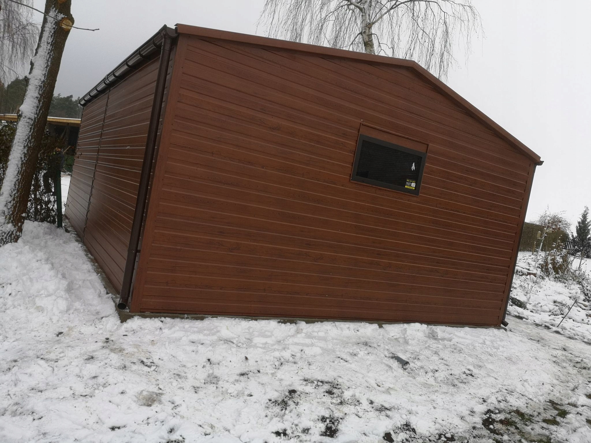 б> Нет необходимости использовать несущие колонны внутри зала или склада, что позволяет более эффективно использовать пространство внутри объекта.Крыша выполнена из ферм закрытого профиля, а это значит, что все нагрузки распределяются равномерно на конструкцию зала и стены. Для стен также использовались закрытые профили, которые были дополнительно укреплены горизонтальными стойками. Весь жестяной гараж покрыт первоклассным листовым металлом под дерево цвета матового ореха. На передней фронтонной стене установлены автоматические подъемные ворота в цвет гаража. На боковой стене имеется дополнительная входная дверь, а на задней стене небольшое окно размером 60х80 см. Снаружи гараж был отделан арматурой из листового металла и водосточными желобами. Все это выглядит очень красиво, а благодаря двускатной конструкции крыши оно впишется в современную архитектуру.