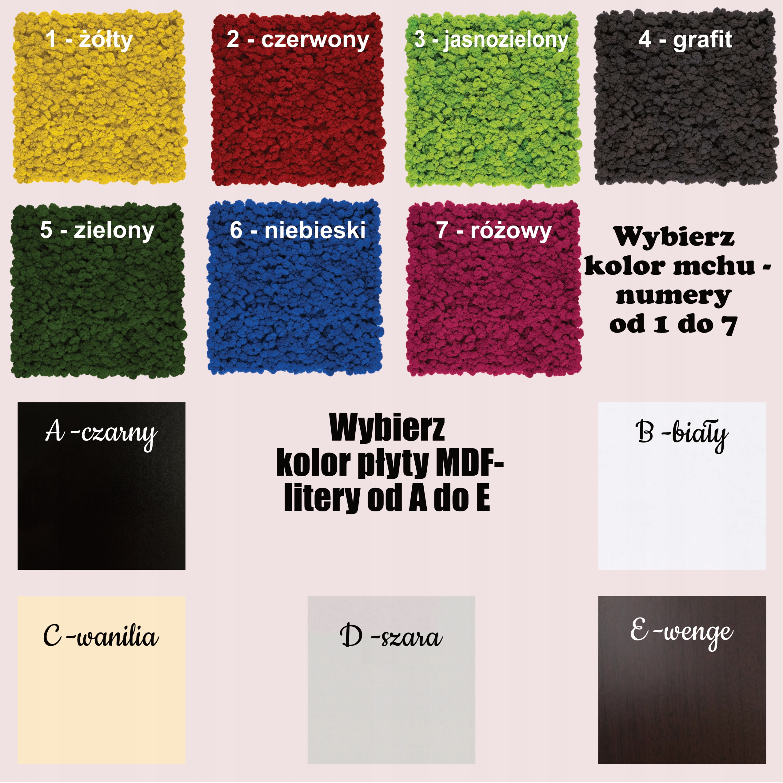При оформлении заказа введите, например. 1А или 3, 4 Б. Какую конфигурацию мха и цвет рамы выберете вы сами.