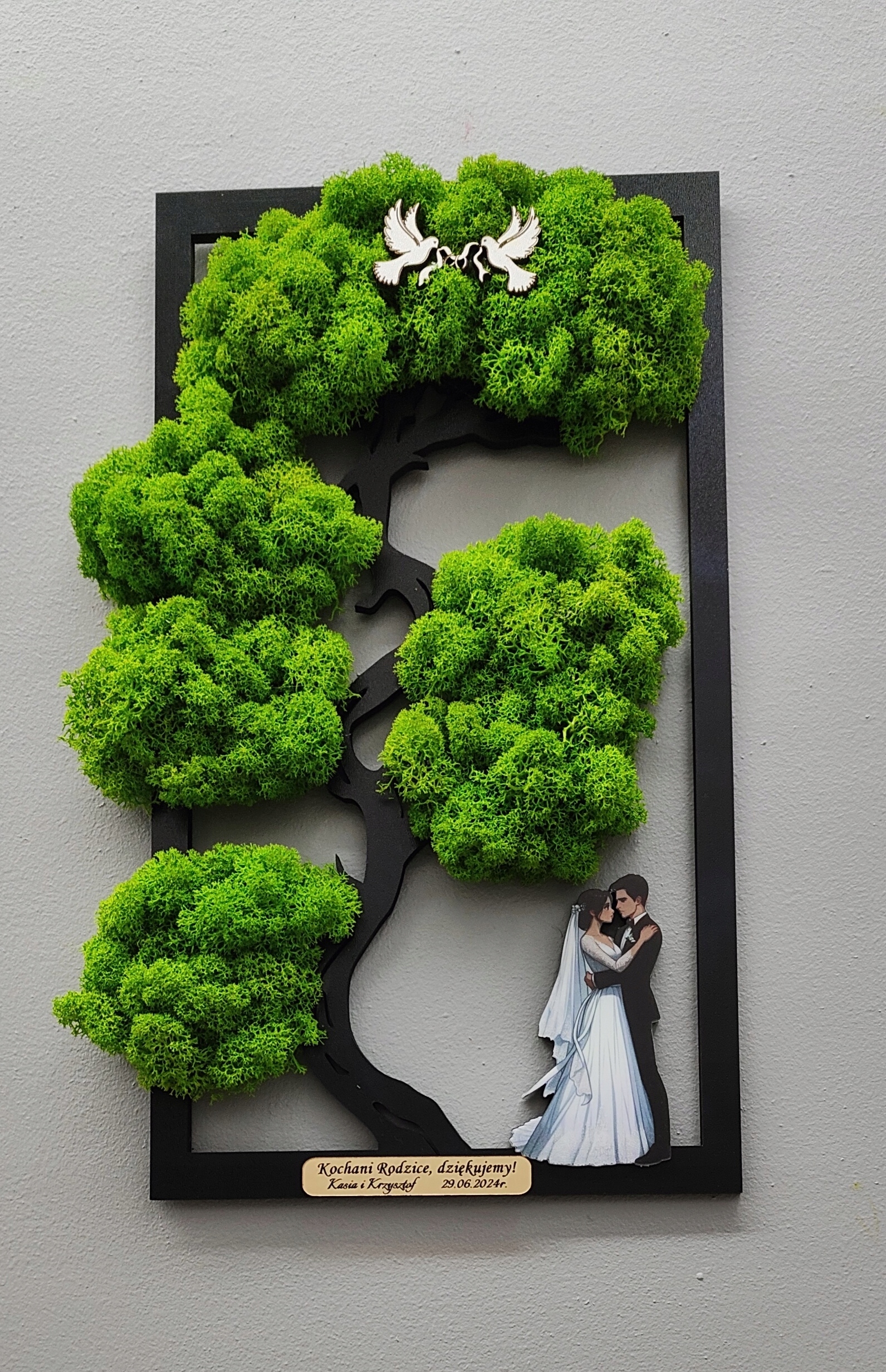 Бонсай - дерево счастья в подарок родителям/свидетелям. Дерево, украшенное мхом. В елку включена фигура жениха и невесты – она в белом платье, он в черном костюме и белой рубашке. Красочная УФ-печать делает фигурки «живыми».