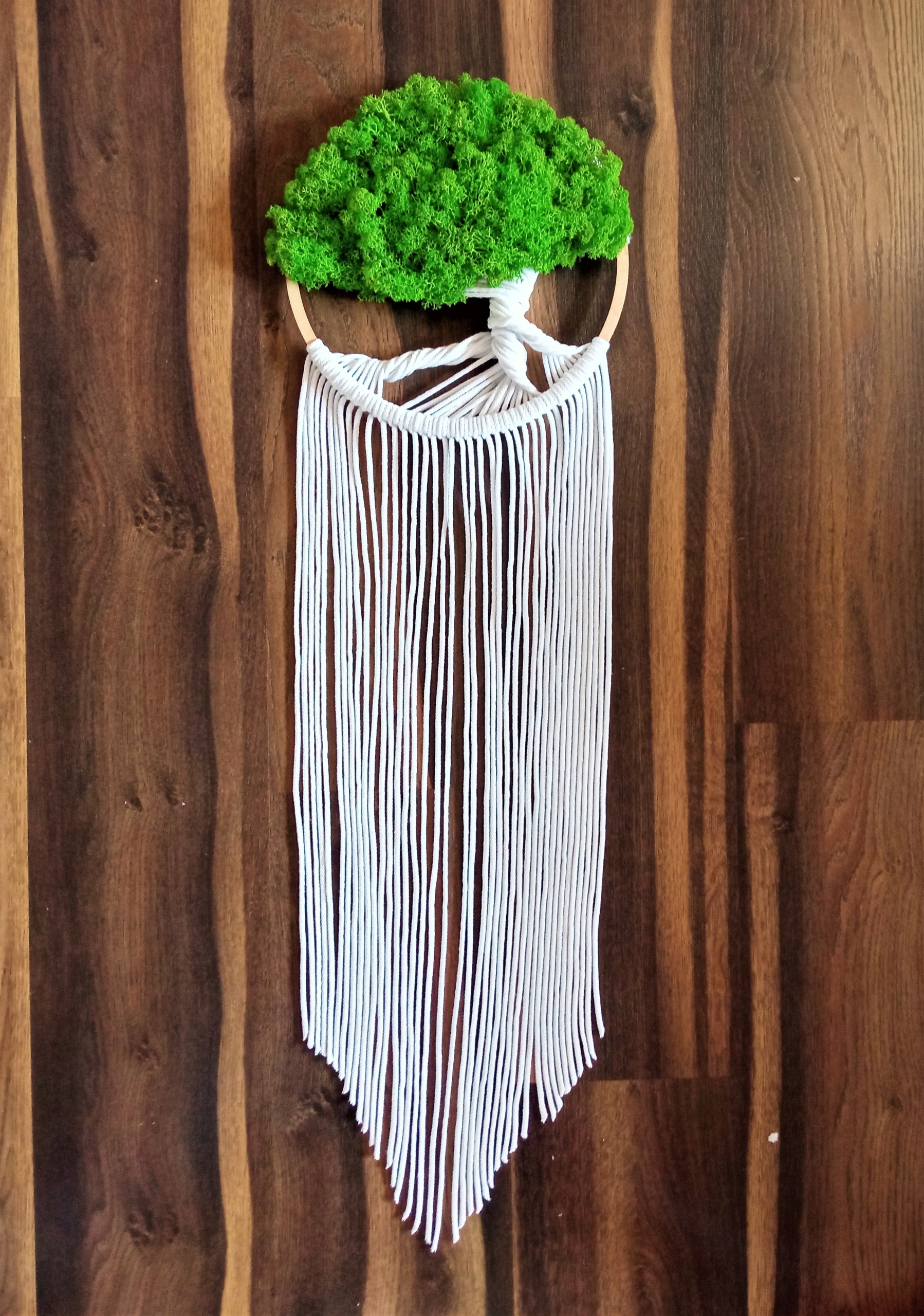 Ловец снов выполнен в технике макраме из высококачественной хлопковой нити с хлопковым наполнителем толщиной 3 мм. . Украшен разноцветным заготовленным оленьем мхом очень хорошего качества - имеет сертификат ISO и тест на негорючесть. Натуральный олений мох из Норвегии, цвет мха получен за счет натуральных красителей.