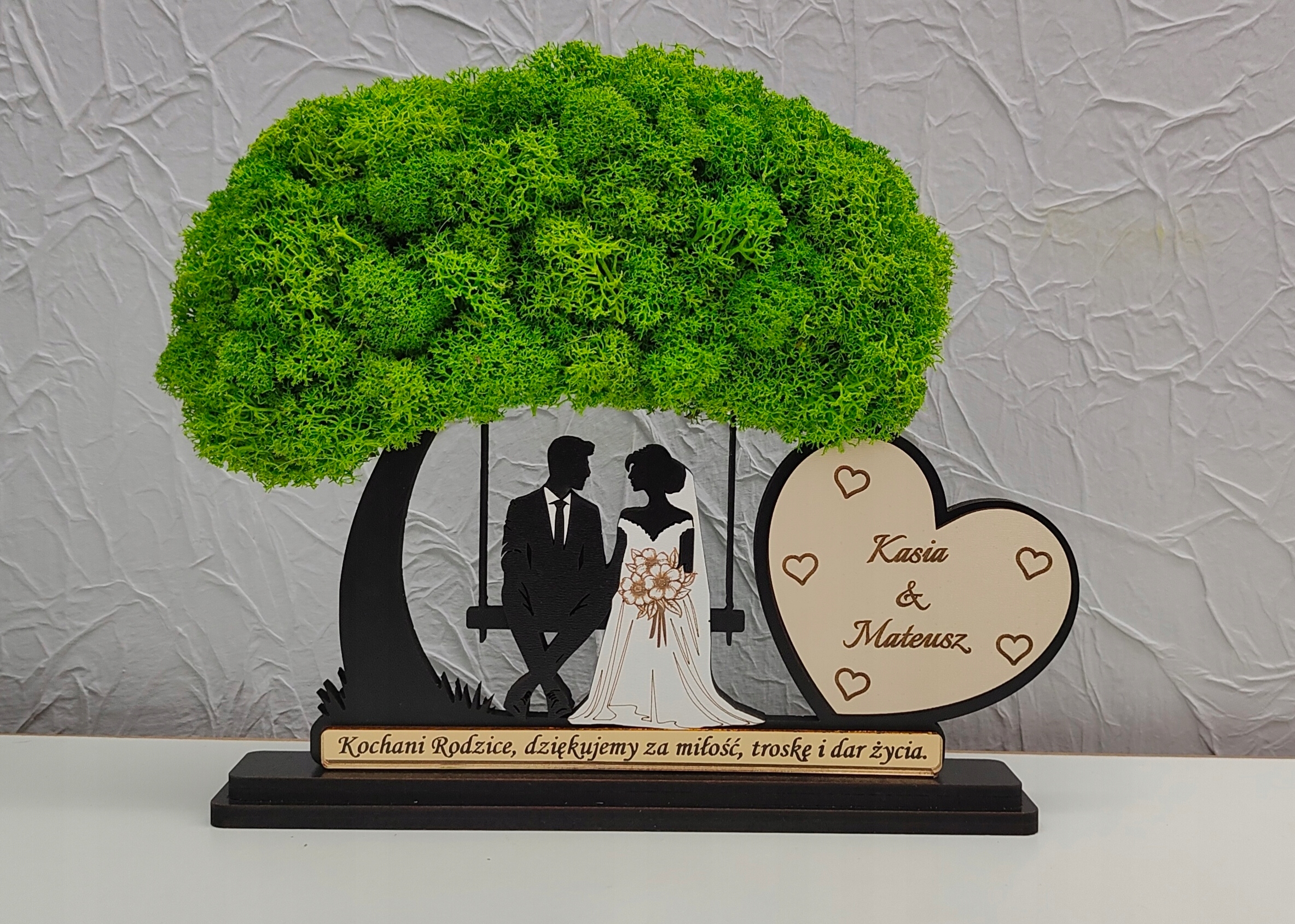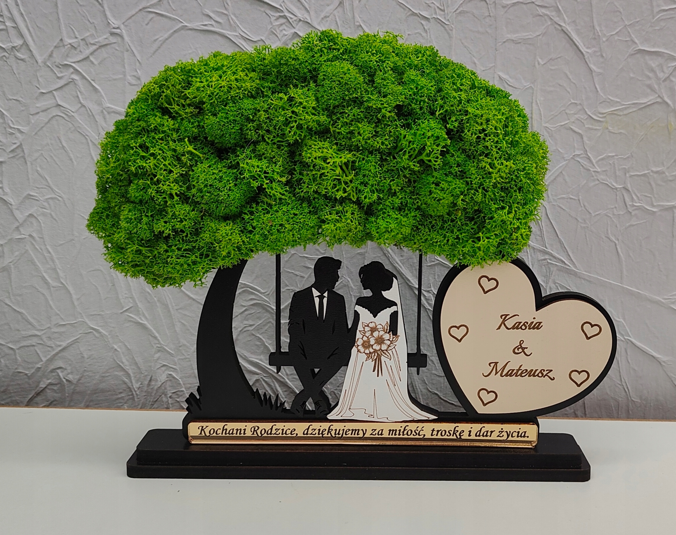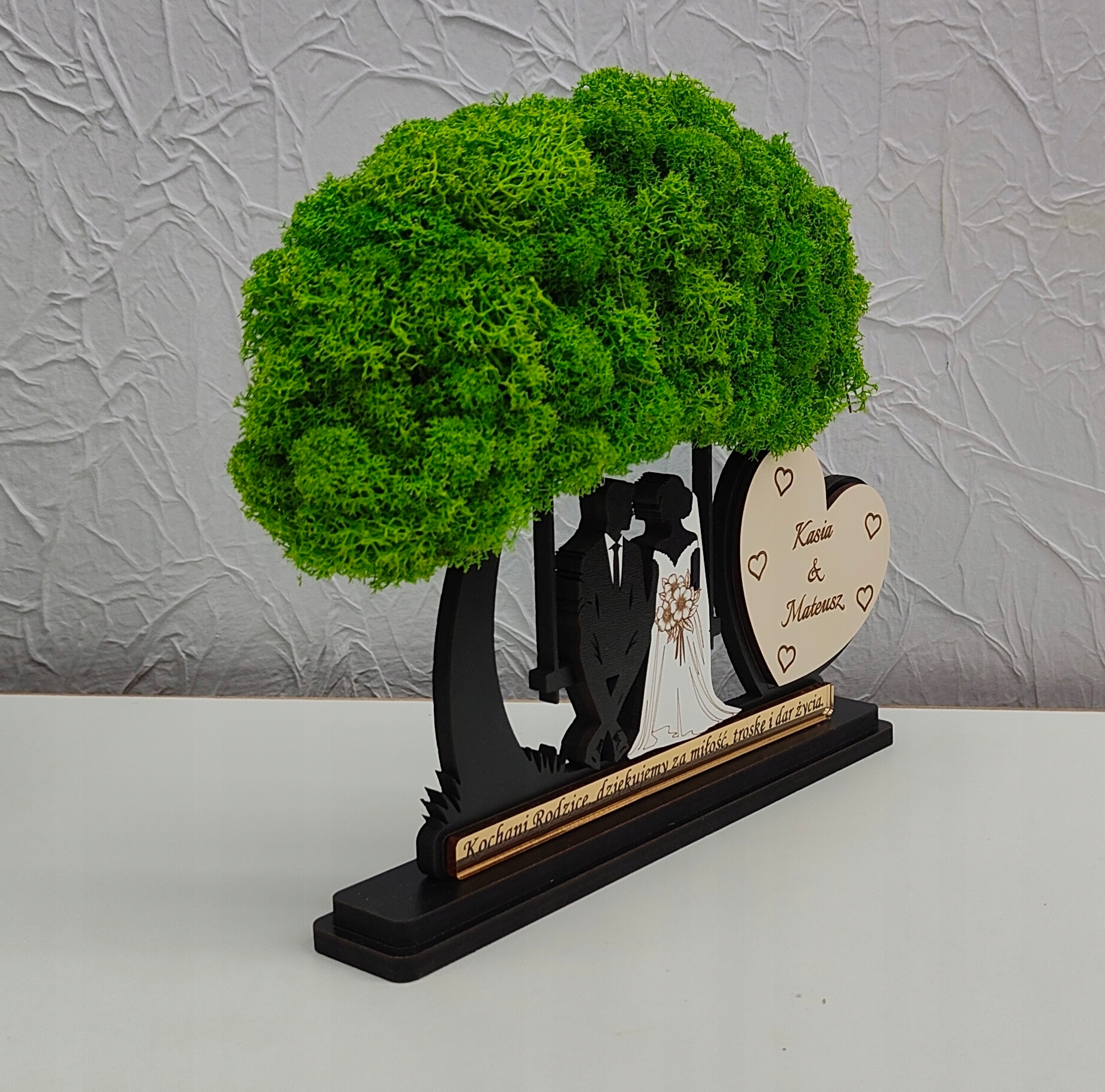 Красивое дерево с мхом с женихом и женихом, сидящим на скамейке. Дерево будет незабываемым и оригинальным подарком для родителей/свидетелей или бабушек и дедушек.