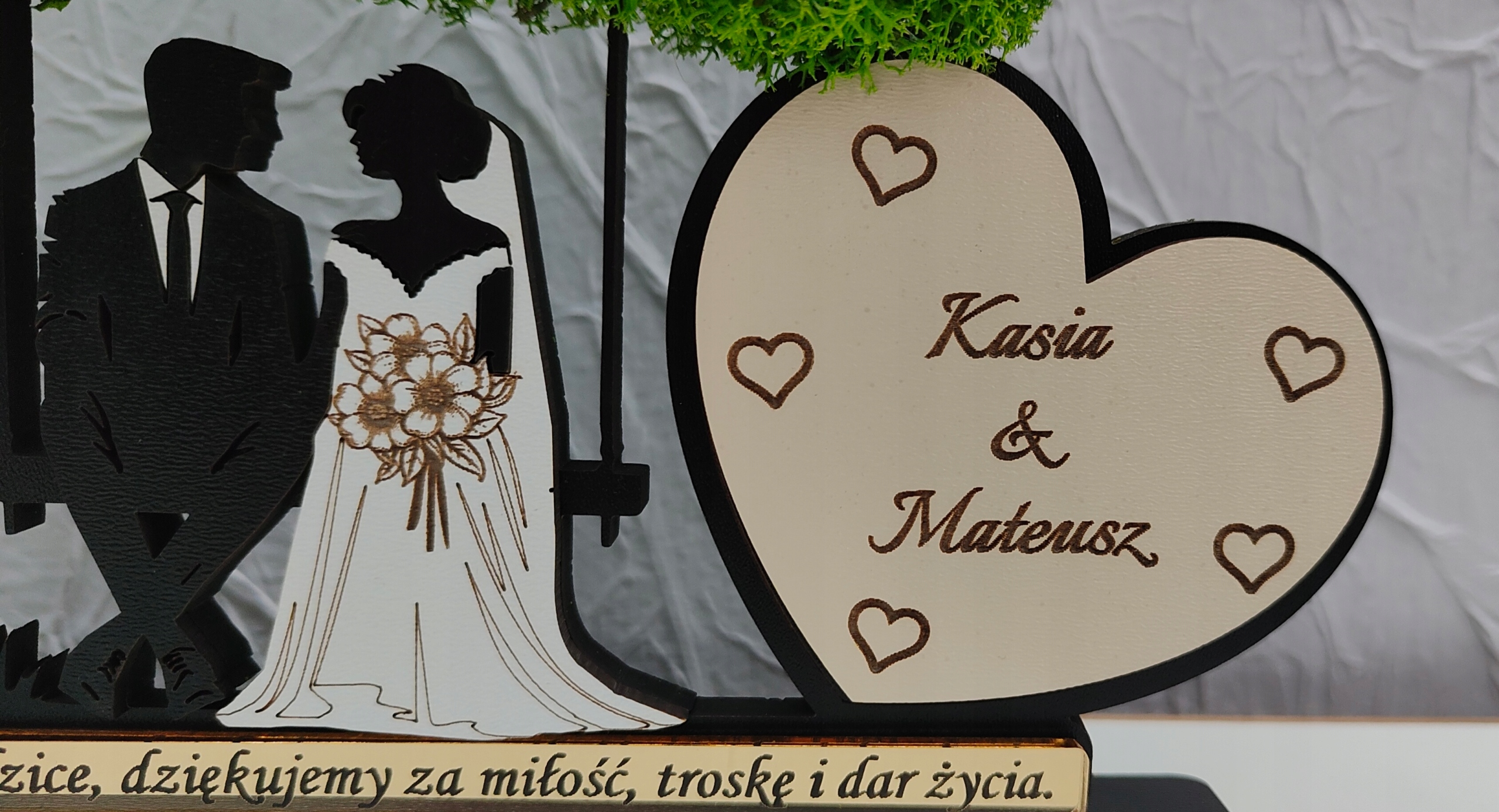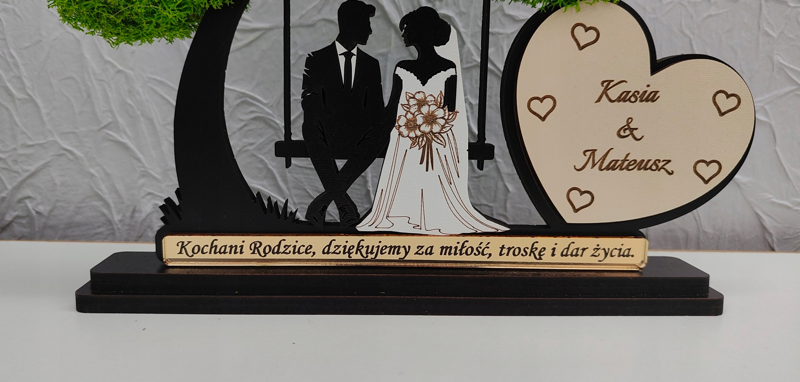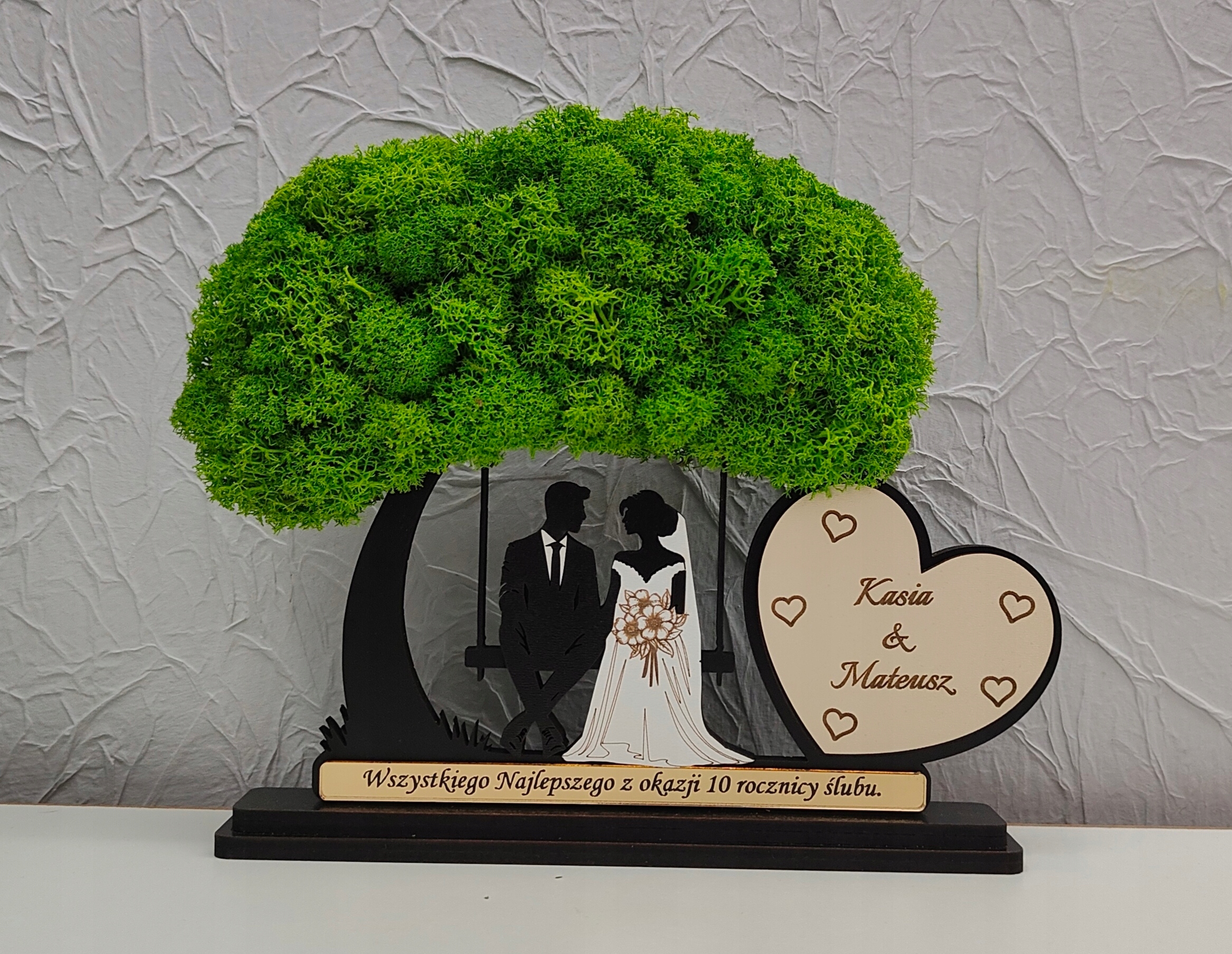 Красивое дерево с мхом с женихом и женихом, сидящим на скамейке. Дерево будет незабываемым и оригинальным подарком для родителей/свидетелей или бабушек и дедушек.