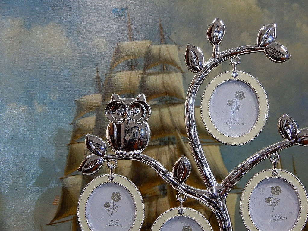 Приглашаю Вас приобрести красивое "дерево счастья" с совой, на котором Вы сможете кратко изложить свою родословную на 12 подвесках.Изделие выполнено из цинкового сплава, посеребренное, рамки овальные подвешены. на декорированной рамке с изображением дерева.
