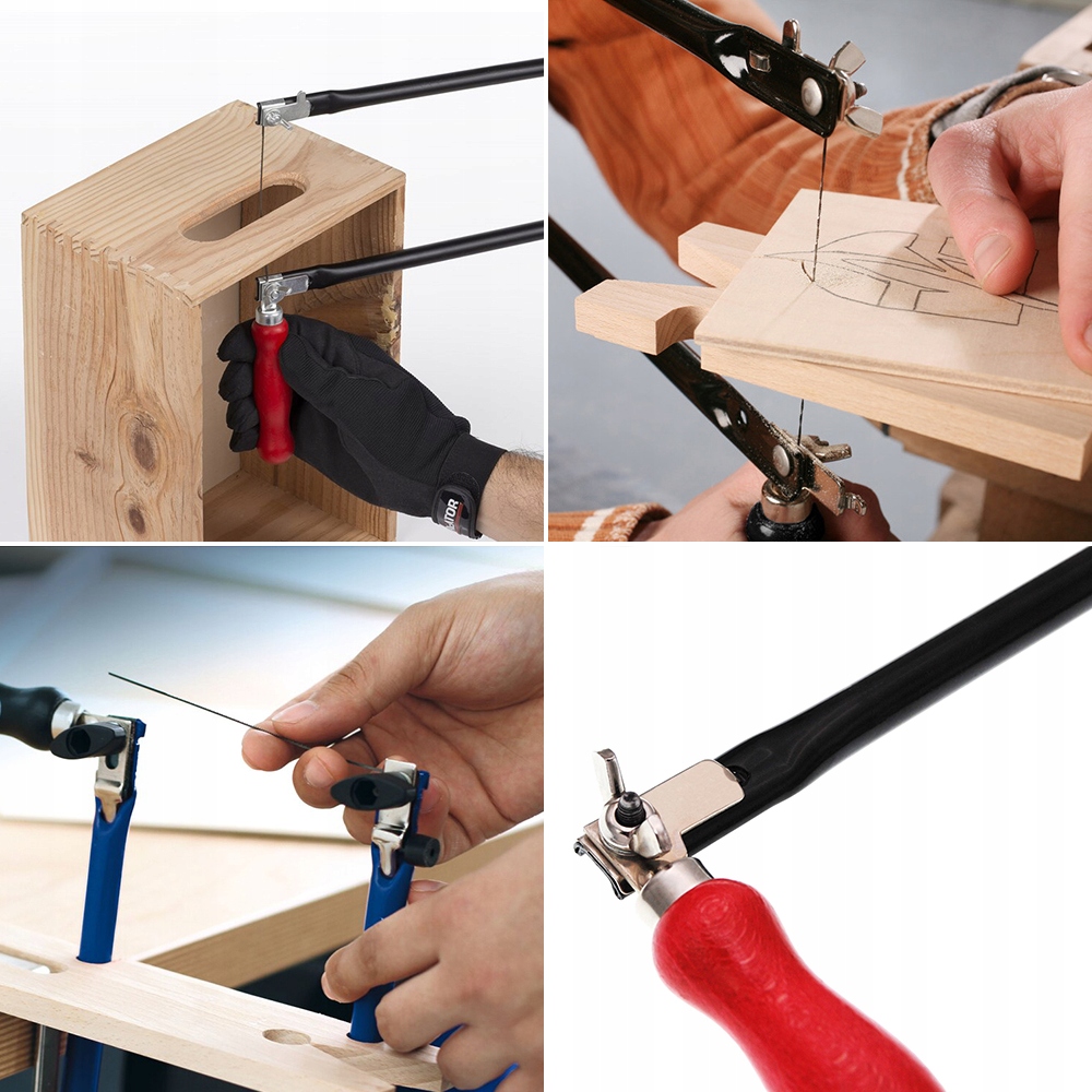 - В комплект входят: 1 х пила (лобзик) с деревянной ручкой (высота пилы 33 см), 1 х металлический зажим, 1 деревянная шайба/доска, 1 ключ для держателя/лобзика, ручная дрель/дрель 28 см со сверлом, 5 пильных полотен/лобзиков длиной 15 см,