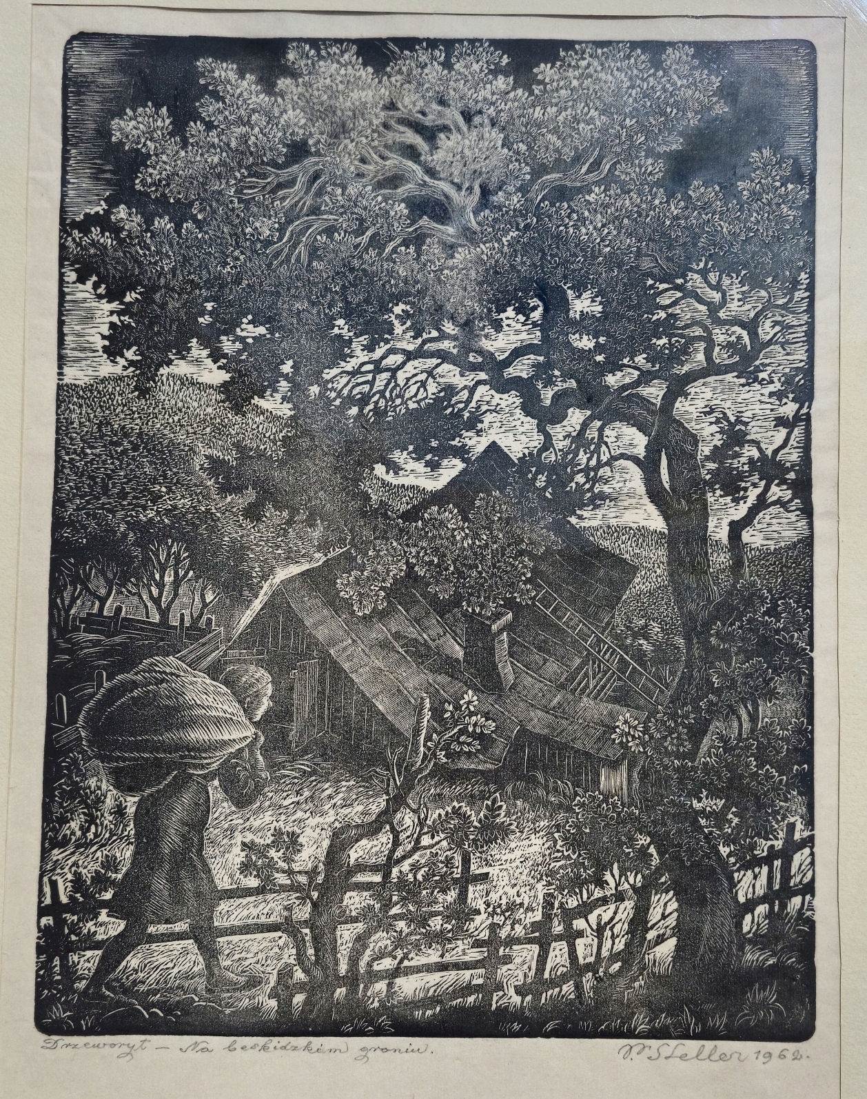 ГРАФИКА ПОДПИСЬ КАРАНДАШОМ: Л.Д.: ДЕРЕВЯННАЯ РЕЗКА НА БЕСКИДНОМ ГРОН.; П.Д.: П. СТЕЛЛЕР 1962.