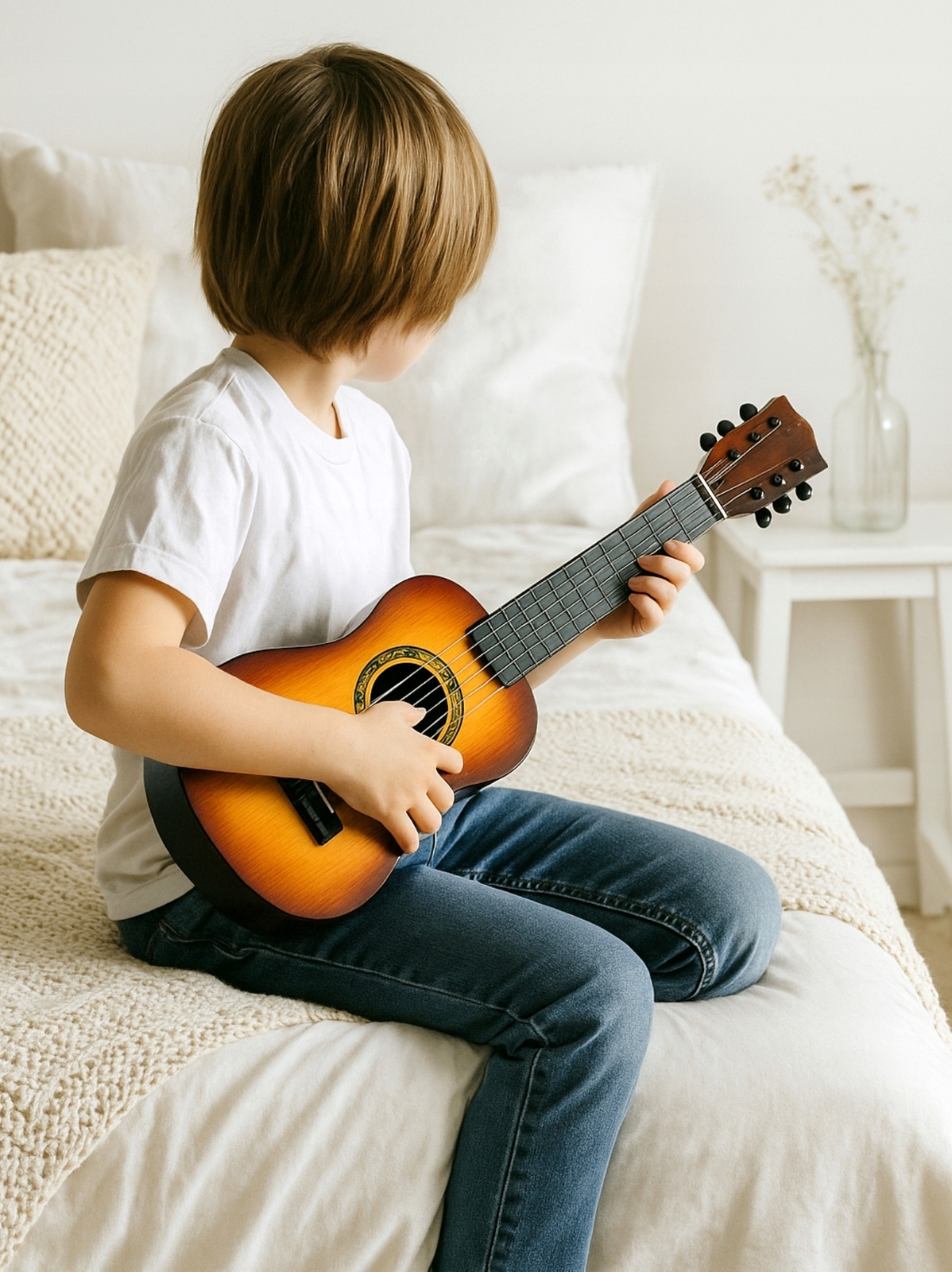 Гитара имеет практичную и удобную для детей форму, благодаря которой ее легко брать и держать. Благодаря ему дети учатся распознавать звуки, а игра на инструменте положительно влияет на их чувство ритма. Кроме того, игрушка стимулирует творчество и творческое мышление, учит терпению и улучшает память и концентрацию.