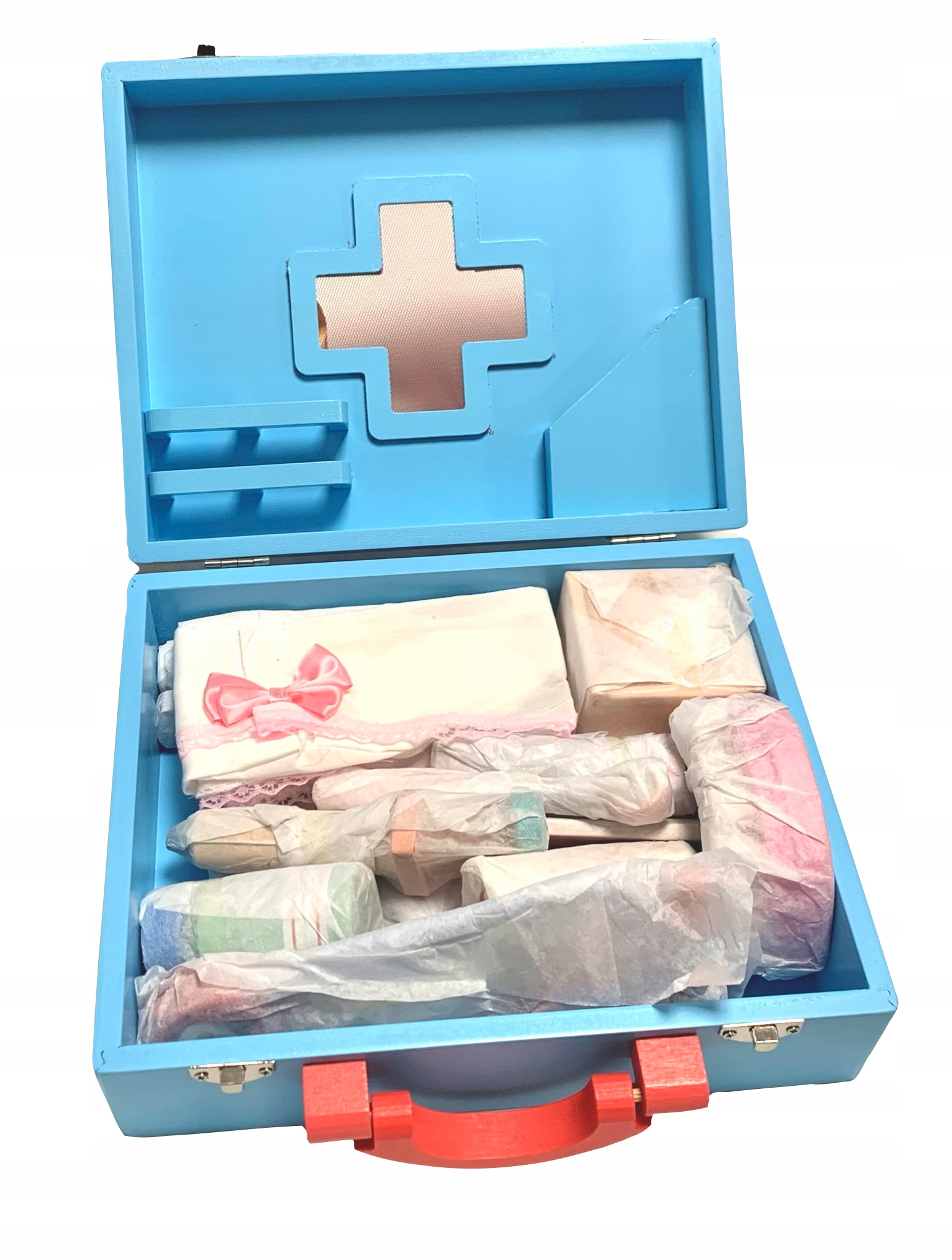 Деревянная аптечка позволит вам сыграть роль врача, спасателя, стоматолога или, например, медсестры.