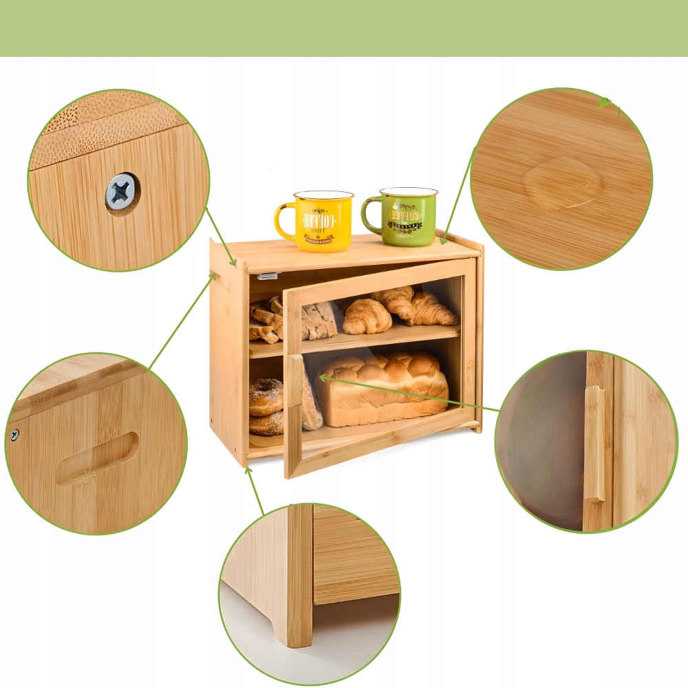 Наша бамбуковая хлебница — это функциональное и элегантное дополнение к вашей кухне, которое не только отлично хранит хлеб, но и дольше сохраняет его свежим. Oокно с plexi позволяет быстро проверить содержимое, а регулируемая полка позволяет адаптировать пространство под Ваши нужды. Хлебница Pierre — это сочетание эстетики и функциональности, благодаря которому ваш хлеб всегда будет под рукой и свежим.