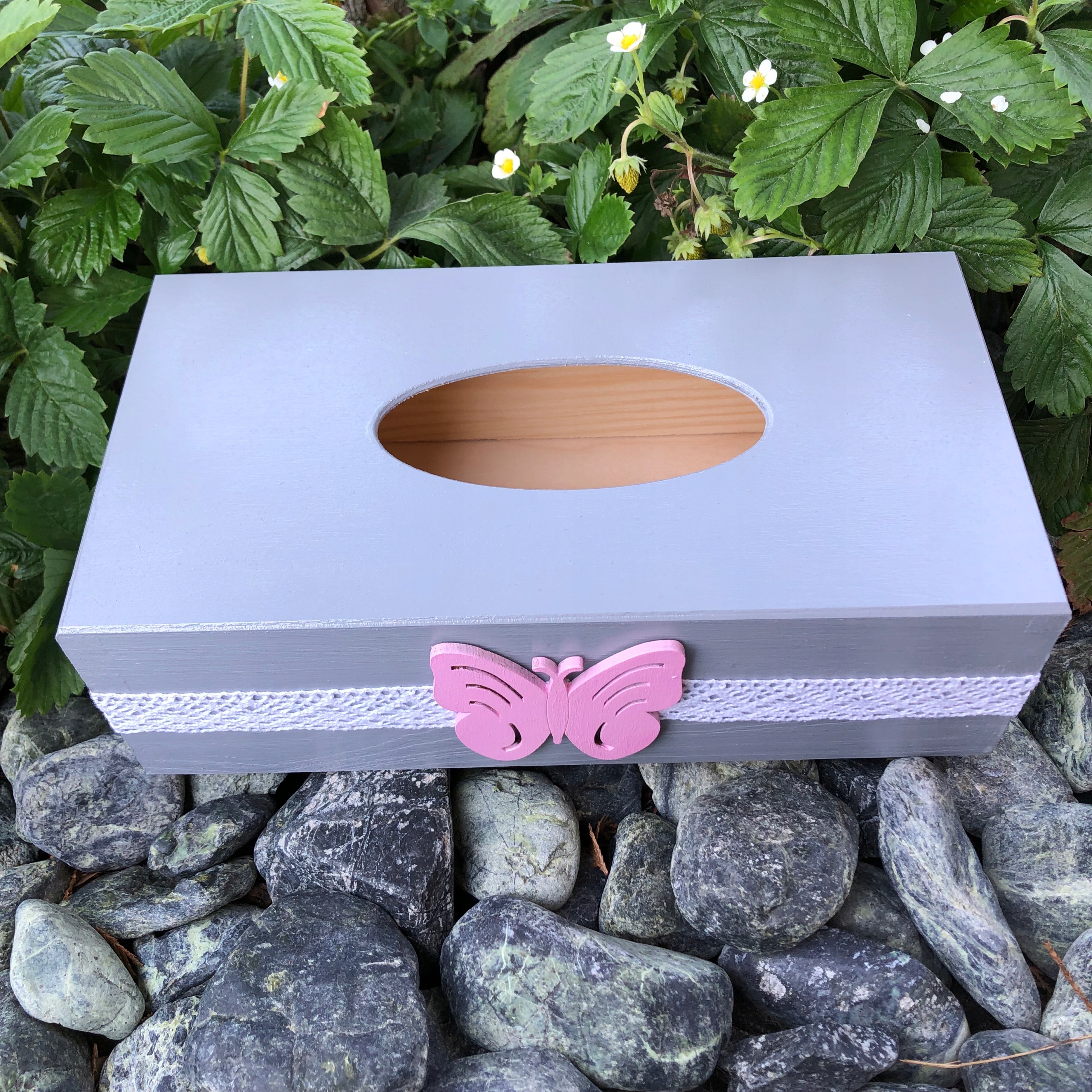Коробка для салфеток выдвигается снизу. Изготовлена из самого высокого качества. дерево серого цвета с прикрепленной деревянной розовой бабочкой и кружевом.