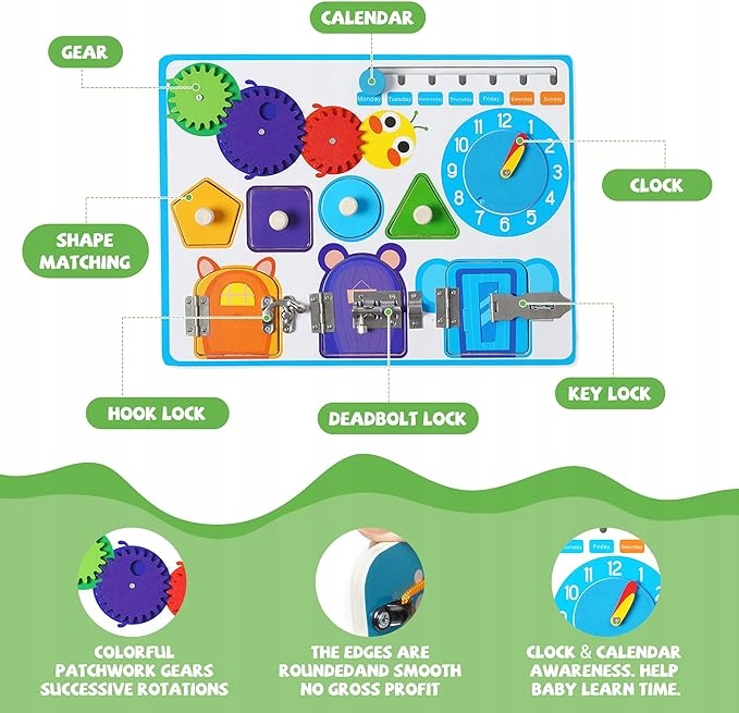 У этой доски есть два мотива: океан и часы, благодаря тому, что дети могут изучать базовые жизненные навыки, в то время, даты, открывающие замки, подходящие формы, шнуровку и многие другие.