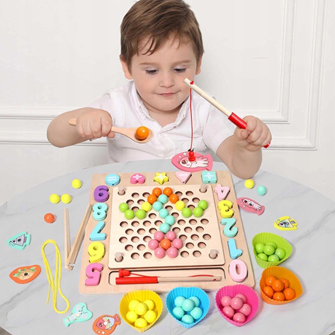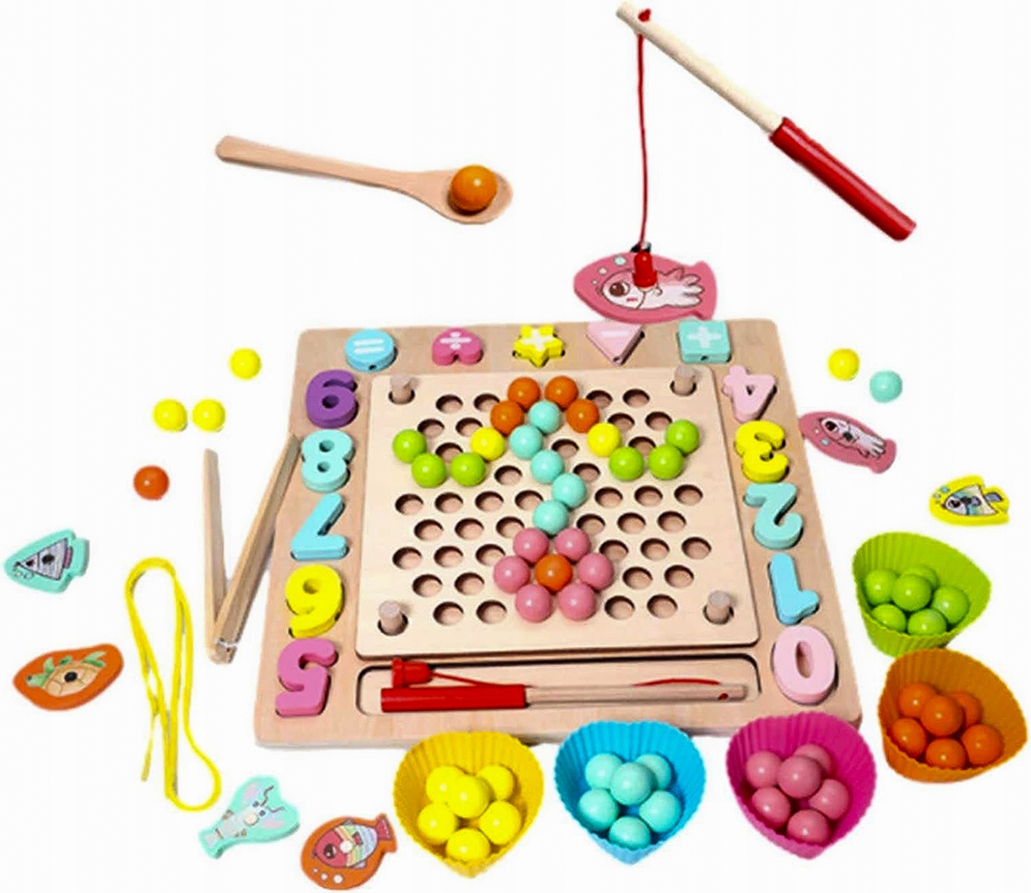 Игрушка состоит из различных элементов, таких как кубики, бусины, цифры, рыбки и шарики, которые обеспечивают различные сенсорные стимулы. У вашего ребенка будет возможность улучшить навыки счета и сортировки, а также развить навыки рисования и логики. Каждый элемент был тщательно разработан, чтобы обеспечить удовольствие и радость от игры.