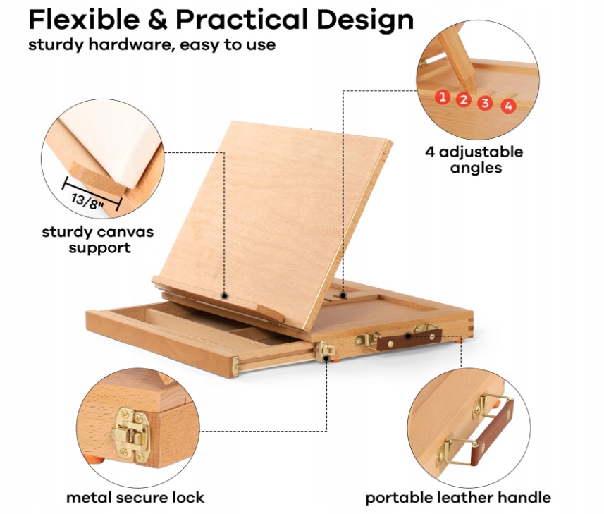 - Этот деревянный настольный мольберт позволяет вам рисовать, раскрашивать или читать, не занимая рук, где угодно! Наклоненная доска принимает четыре положения под прямым углом. Независимо от того, рисуете ли вы акрилом и маслом, рисуете акварелью, делаете эскизы, копируете изображения, демонстрируете или используете его в качестве планшета для рисования, он вас полностью удовлетворит.