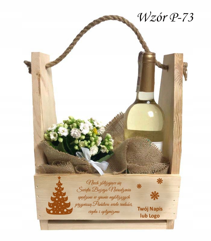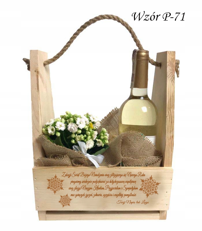 Деревянная шкатулка-переноска для цветов, алкоголя, конфет с толстой джутовой верёвкой и индивидуальной надписью или логотипом компании. Прочный и функциональный контейнер, который можно с успехом использовать в качестве ящика для пива, вина, сладостей или садового инвентаря. Его также можно использовать как деревянную подставку для цветов. Коробка идеальна в качестве подарка, благодарственного подарка или корпоративного подарка на Рождество. Классическая деревянная форма переноски с рождественской гравировкой наверняка понравится каждому. Удобная джутовая веревка облегчает переноску и является прекрасным дополнением к натуральному дереву. В коробку поместятся 6 бутылок по 500 мл, два небольших цветочных горшка или другие предметы аналогичного размера. Персонализация содержит максимум несколько слов/слов/цифр (более длинные тексты принимаются в графическом варианте). Сопоставляем гравировку с выбранным рисунком и делаем ее на одной из лицевых досок переноски.