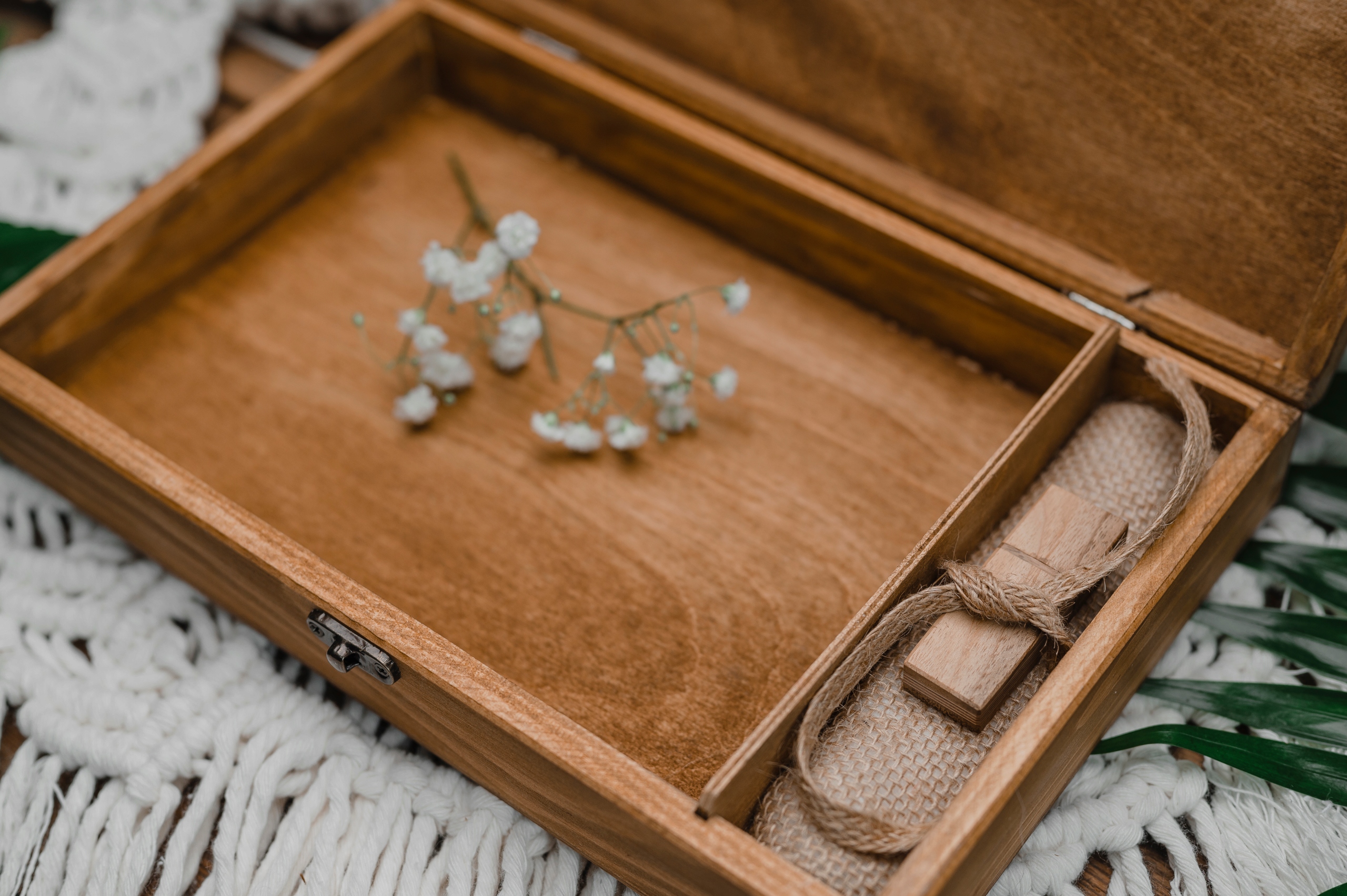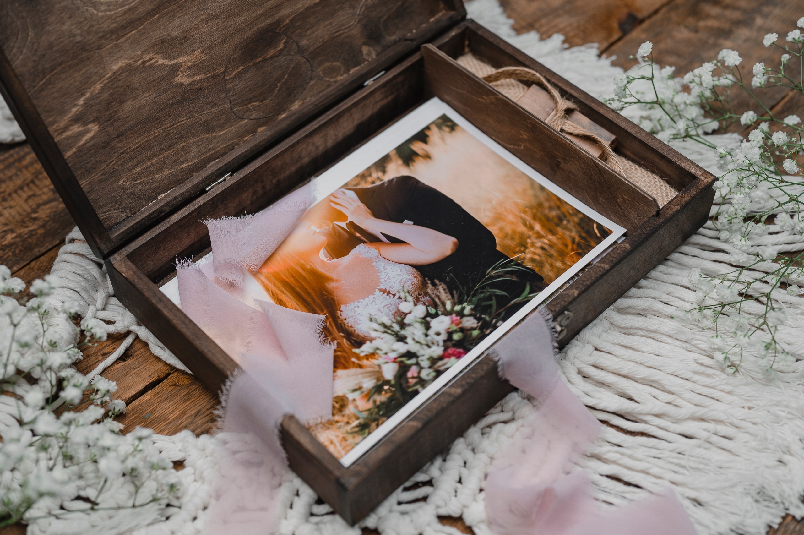 Место для флешки застелено джутовой подушкой. USB-накопитель крепится с помощью ленты из того же материала. Рядом есть место для фотографий размером 15 х 23 см, 15х21, которые перевязаны джутовой верёвкой.