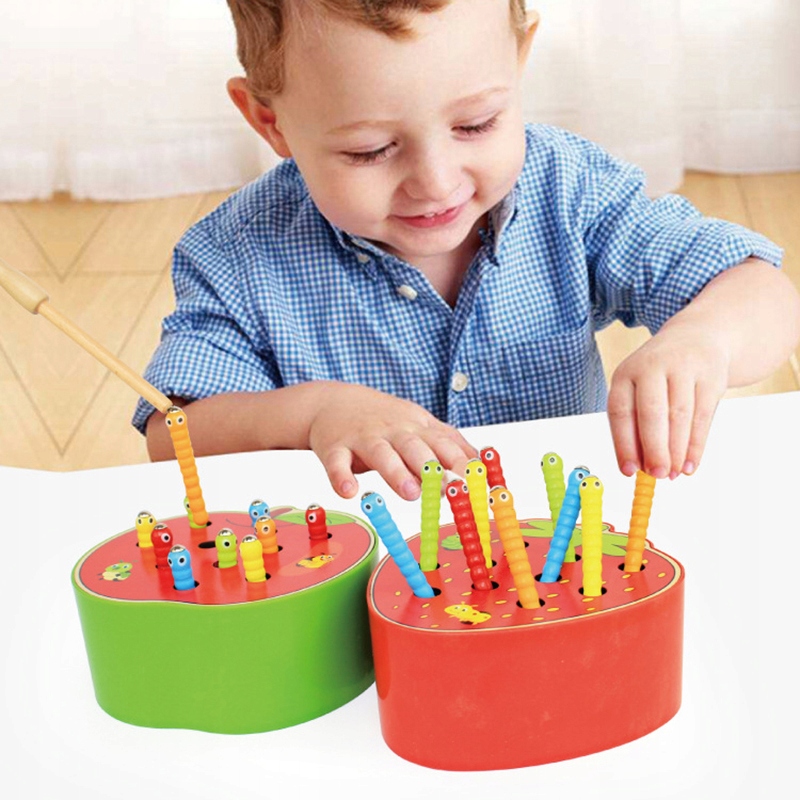 ⭐ В игре ловят червей, спрятанных в норках, деревянной палочкой с магнитом на конце, а затем вставив их обратно. Это большая задача для малыша – она требует концентрации внимания и ловкости рук.