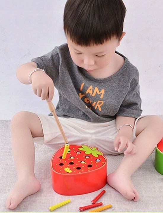 Эта уникальная деревянная игрушка — отличная идея, чтобы занять вашего малыша. В игре нужно ловить деревянной палочкой с магнитом червей, спрятанных в отверстиях фруктов, а затем вставлять их обратно. Это серьезная задача для малыша, требующая концентрации и ловкости рук.