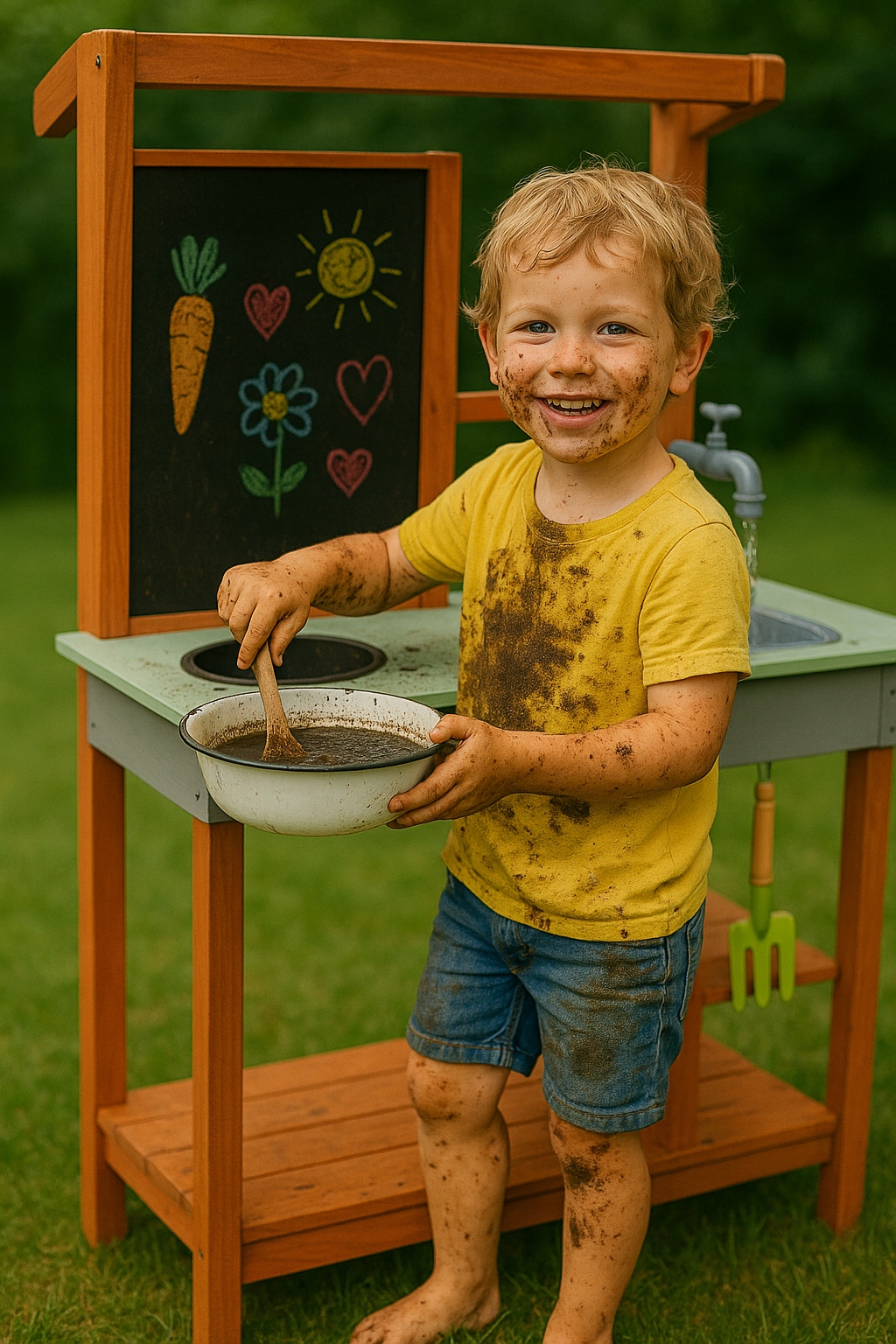 Сплошное, пропитанное дерево выдержит дождь, солнце и сотни кулинарных оборотов. Безопасно для маленьких ручек и отличных идей!