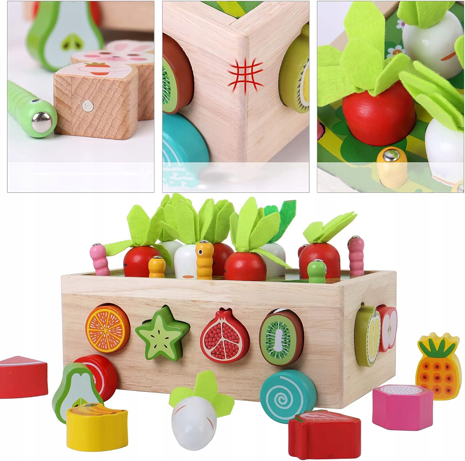 🥕🥕🥕 【Деревянный набор для сбора урожая на ферме】:Образовательная машинка для сбора урожая на ферме Монтессори включает 12 фруктовых блоков разной формы, 8 морковок разного размера, 10 милых червячков и деревянная тележка, в которую можно все это вместить. Деревянные игрушки имеют крупные частицы, полированные края и отвечают потребностям детей в обучении и развлечениях, одновременно отвечая требованиям родителей к безопасности и качеству.