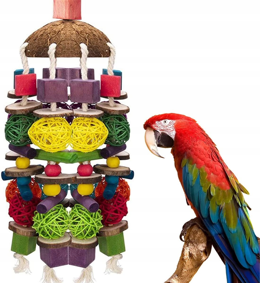 ✅ Игрушки для птиц изготовлены из прочных, безопасных и нетоксичных материалов. Ваши птицы могут играть с ними без каких-либо забот. Игрушка-попугай-птица состоит из натуральной кокосовой скорлупы, вращающейся на 360°, и 8 отдельных частей.