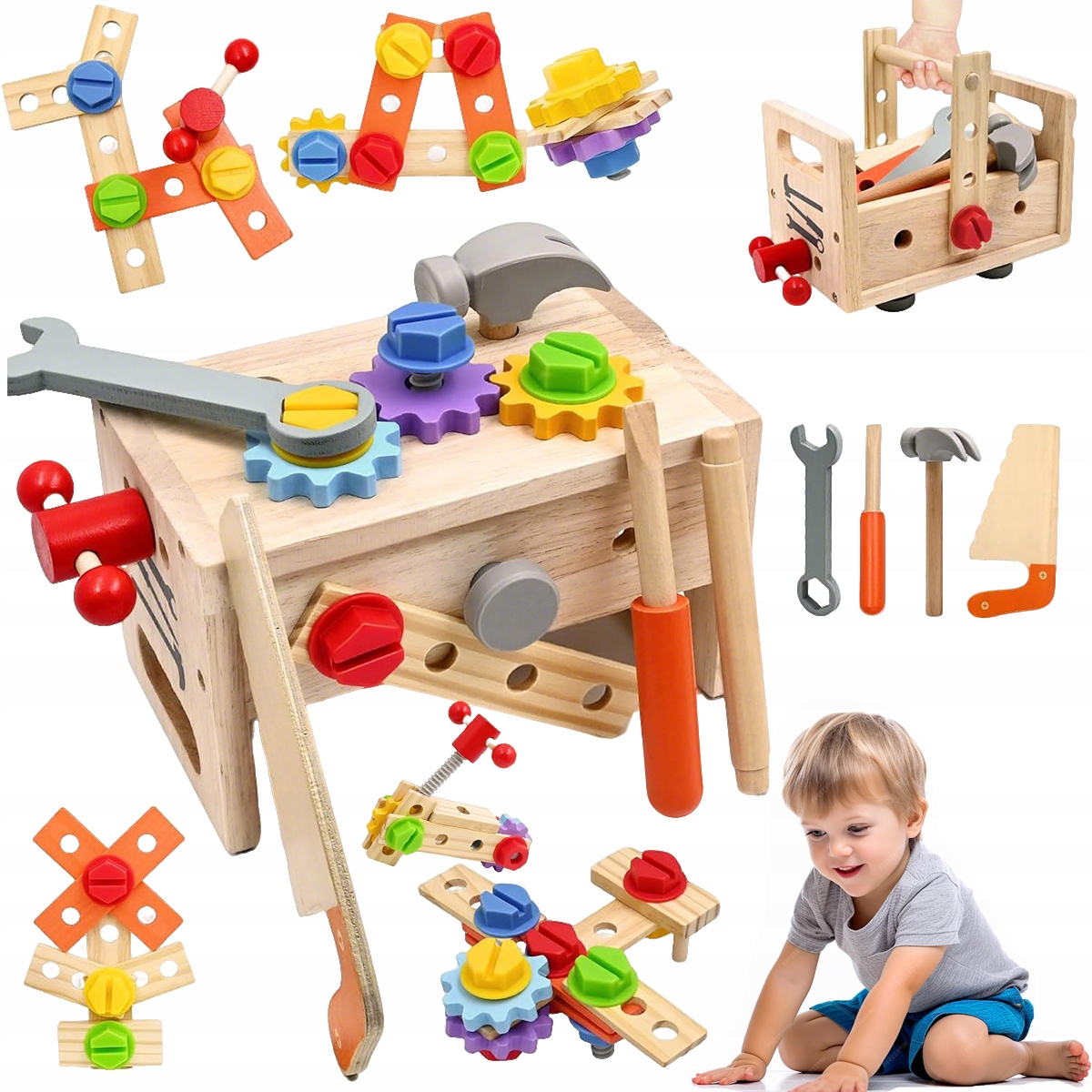 Наш набор инструментов для малышей включает 1 деревянный ящик для инструментов, 1 отвертку, 1 молоток, 1 гаечный ключ, 1 пилу, 3 шестерни, 5 винтов, 2 гвоздя, 5 гаек, 1 ручку и 8 крепежных деталей. Он помогает развивать мелкую моторику, улучшает ловкость, стимулирует воображение и развивает навыки решения проблем. Самое главное для детей – научиться терпеливо сидеть и работать.
