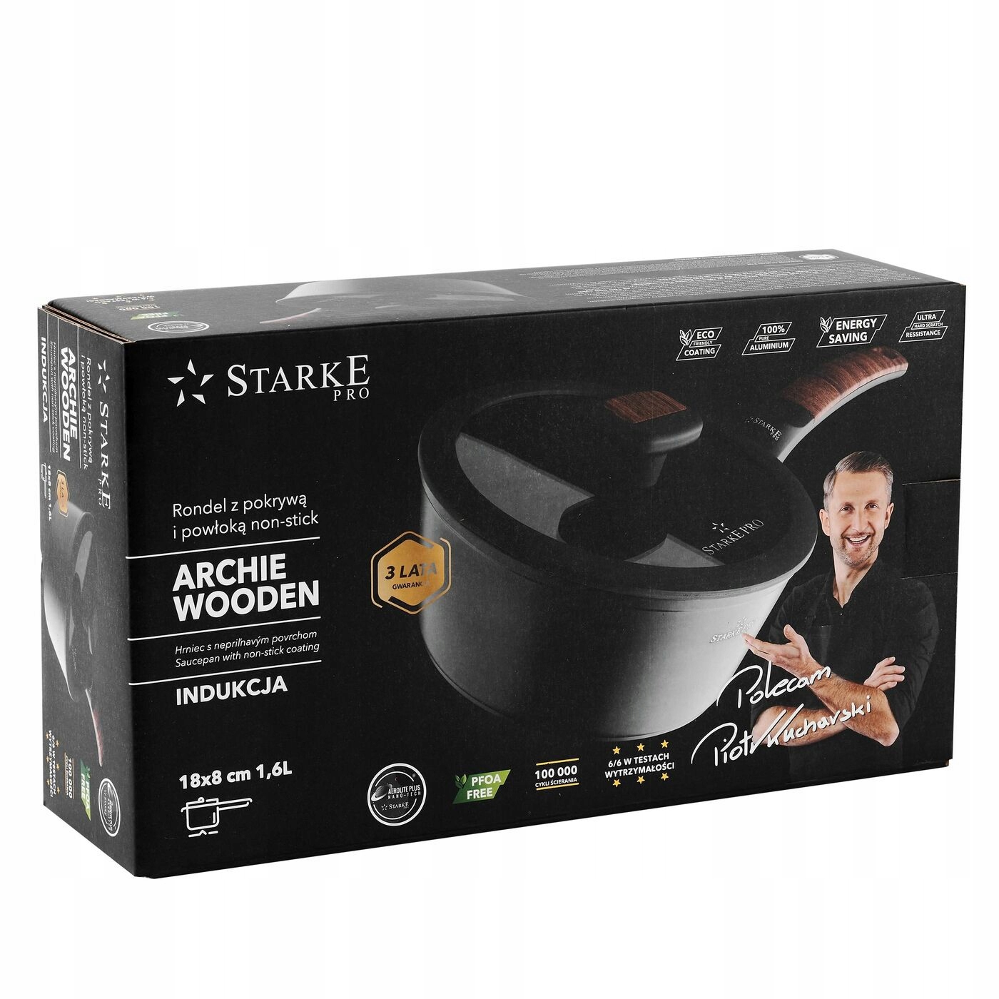 Мраморную кастрюлю Starke Pro Archie объемом 1,6 л с антипригарным покрытием и крышкой можно использовать на индукционных, газовых, керамических и электрических плитах. Его алюминиевый корпус изготовлен методом горячей ковки. Благодаря этому он хорошо сбалансирован, тяжел и имеет прочные стенки. Он также имеет гораздо более высокую устойчивость к высоким температурам и повреждениям. Используемое антипригарное каменное покрытие AEROLITE PLUS (толщина 80-120 микрометров) имеет трехслойную структуру. Оно сложнее, чем стандартное покрытие, и предотвращает прилипание и пригорание ингредиентов. Его долговечность достигает 100 000 циклов истирания – один из лучших результатов в мире. Модель рекомендует Петр Кухарский, который лично проверил ее возможности и поставил высокую оценку. В деревянной кастрюле Archie вы можете готовить и жарить все, что захотите, с небольшим количеством сливочного или оливкового масла. Вы сможете удобно смешивать ингредиенты и мыть изделие. Современный дизайн, вдохновленный элегантностью мрамора и гранита, со вкусом украсит вашу кухню – это простой способ с комфортом приготовить диетические и легкоусвояемые блюда. Крышка, входящая в комплект, стеклянная и имеет силиконовый ободок. Эффективный пароотвод сделает тушение блюд простым и удобным. Дно кастрюли толщиной 3 мм оснащено встроенным индукционным диском.