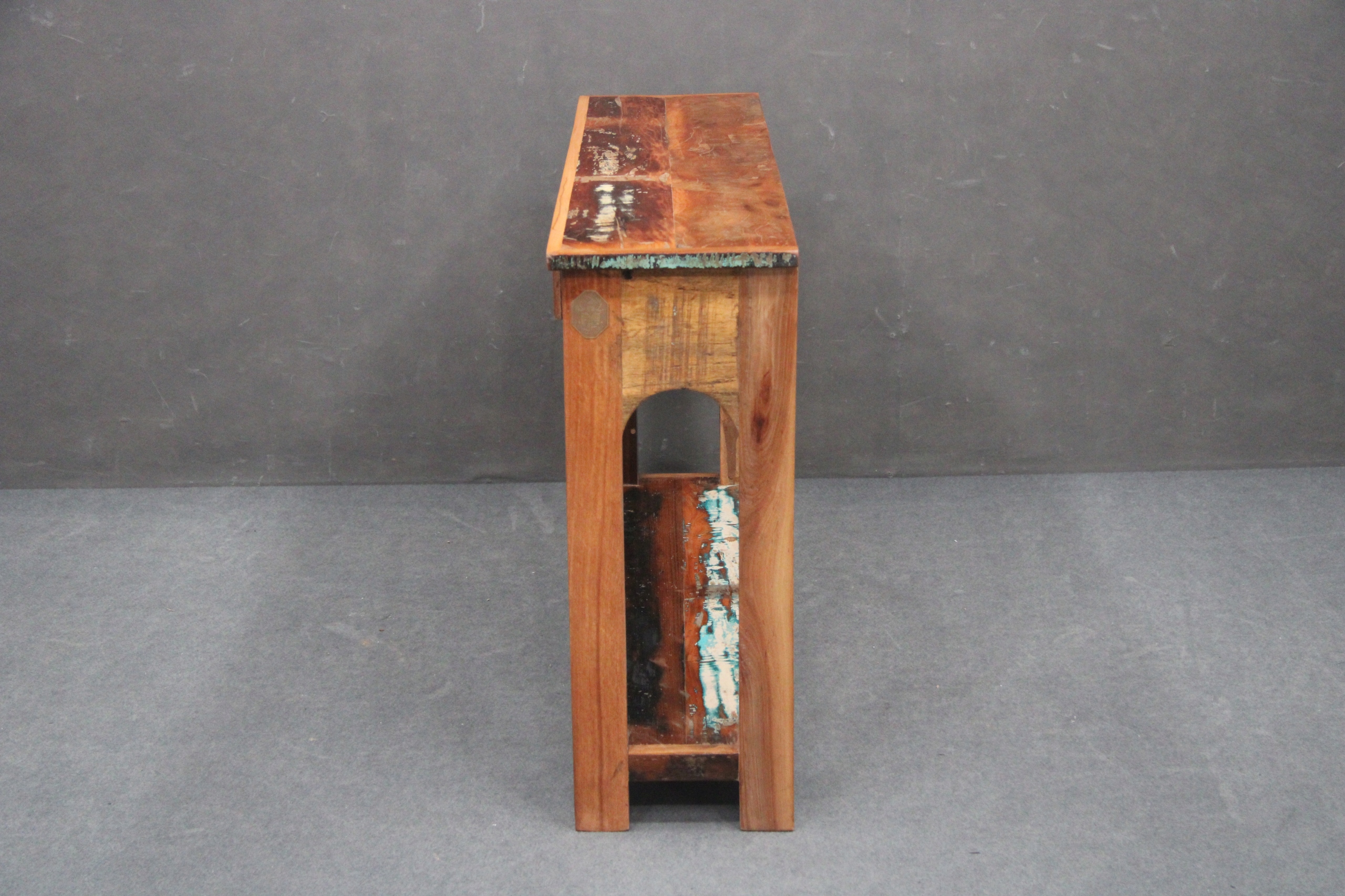 Консоль новая. Изготовлен из индийской древесины, полученной из отходов, а также старых мостов и кораблей, которые являются частью нового стиля. Это означает, что природные ресурсы Земли защищены. Каждый предмет мебели уникален благодаря ручному изготовлению и структуре дерева. Цвет и структура дерева (небольшие трещинки, дырочки, неровности, которые специально сделаны) подчеркивают индивидуальность мебели.