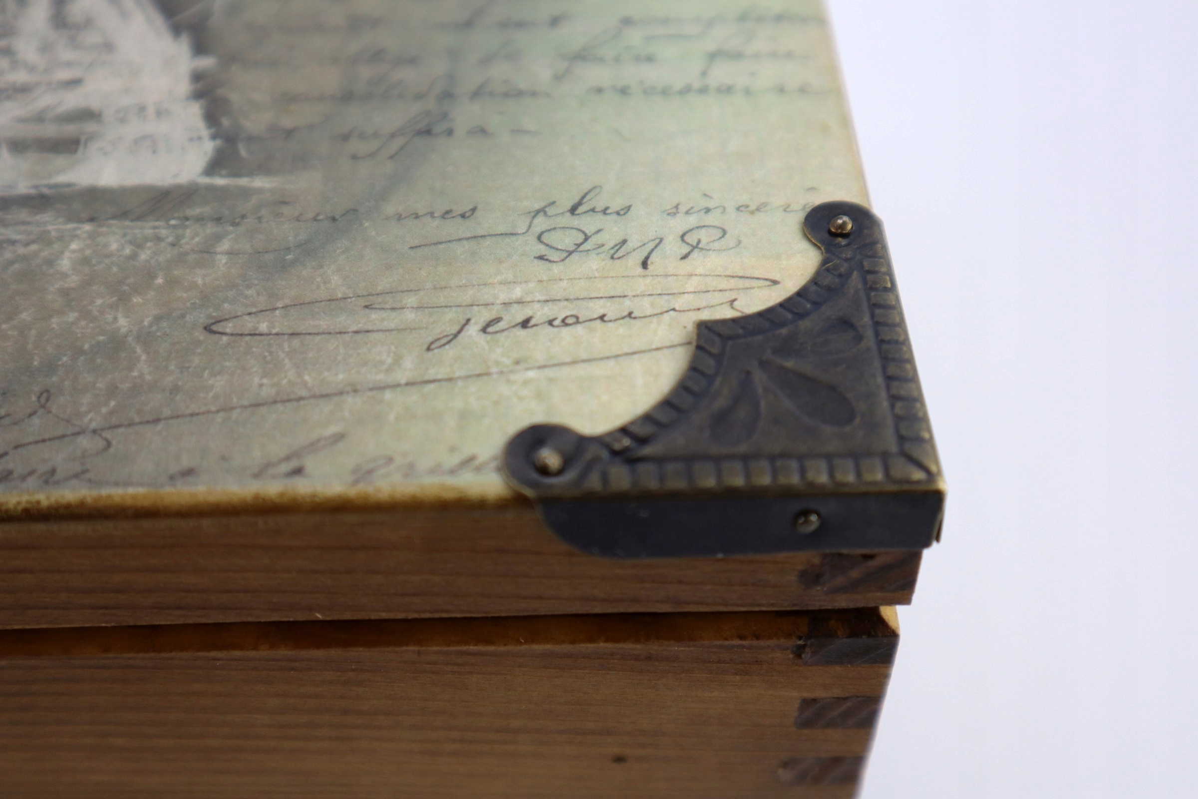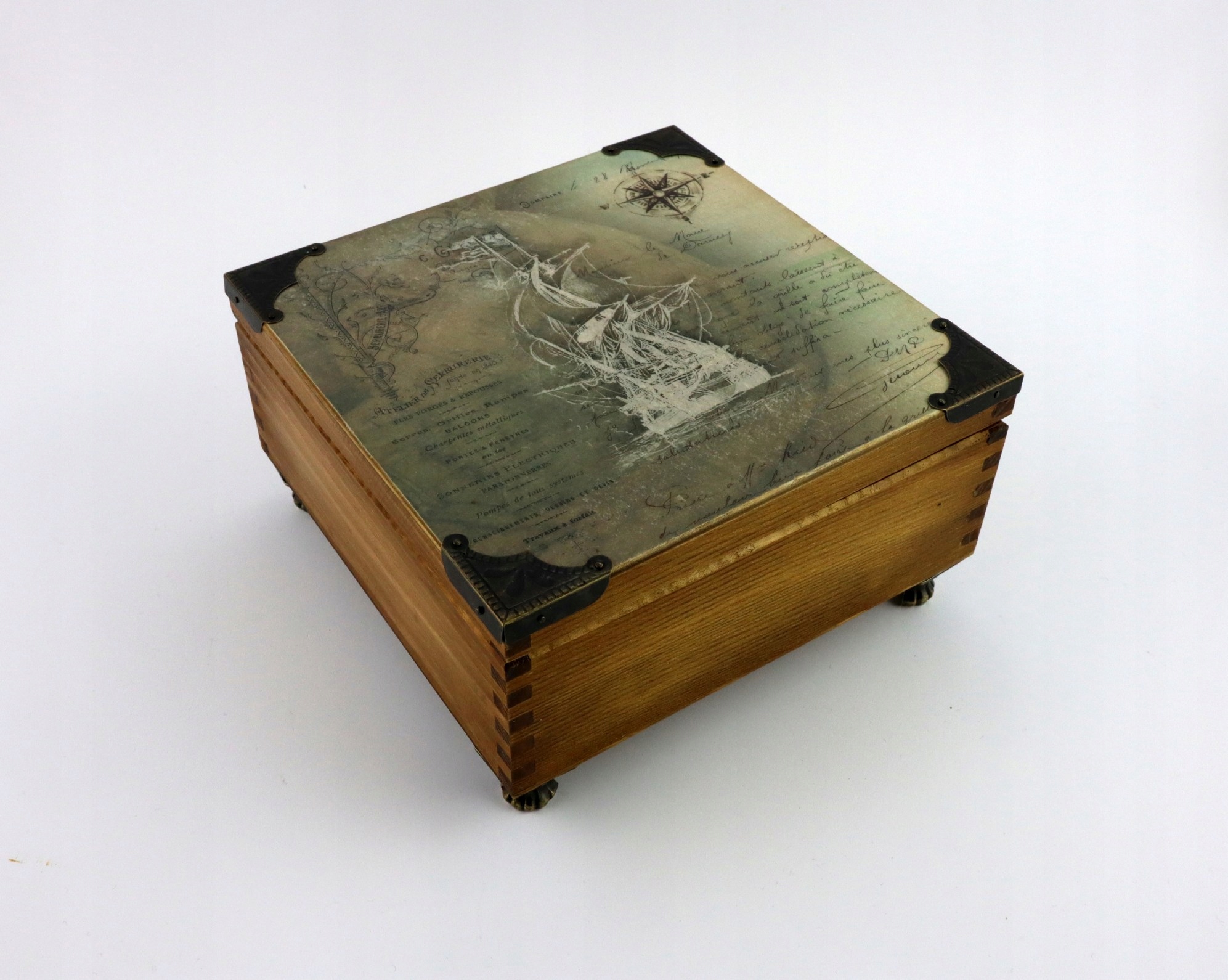 Очень простой ящик, расписанный вручную, декорированный методом декупажа бумагой прямиком из экспедиции Магеллана