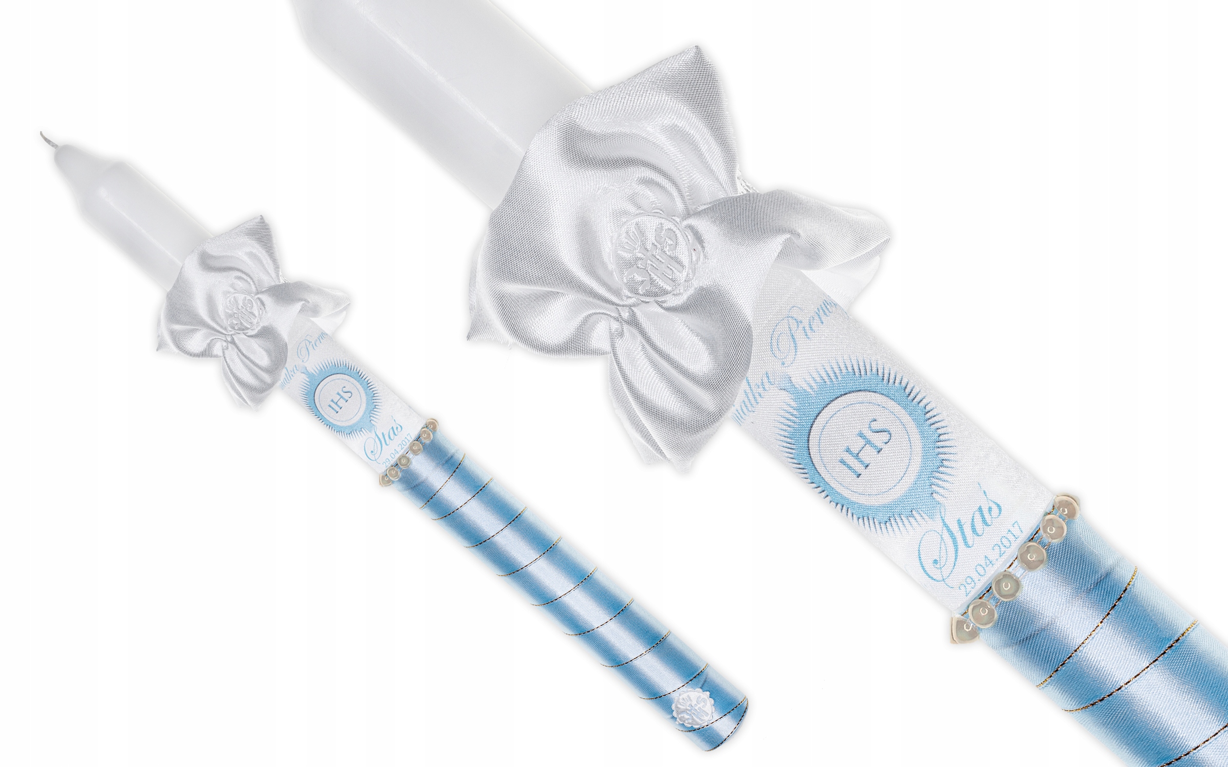 — свеча, выполненная из синего атласа с золотым акцентом и жемчугом. Капельница и нижняя часть свечи украшены символом IHS, подчеркивающим празднование Первого Святого Причастия.