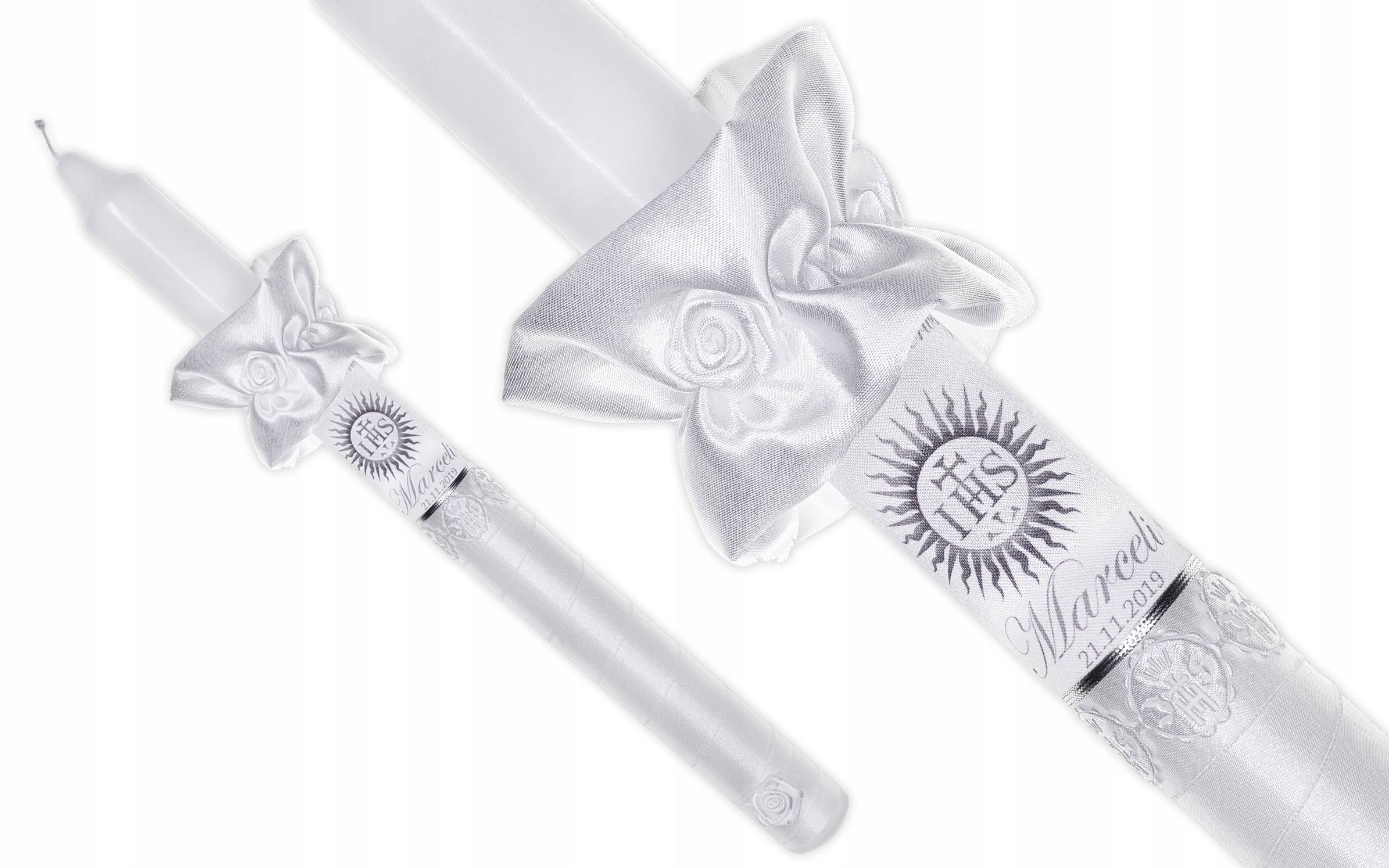– это свеча с жемчужным кольцом и белым атласом с серебряным акцентом, капельница и нижняя часть свечи украшены символом IHSподчеркивая празднование Первого Святого Причастия.