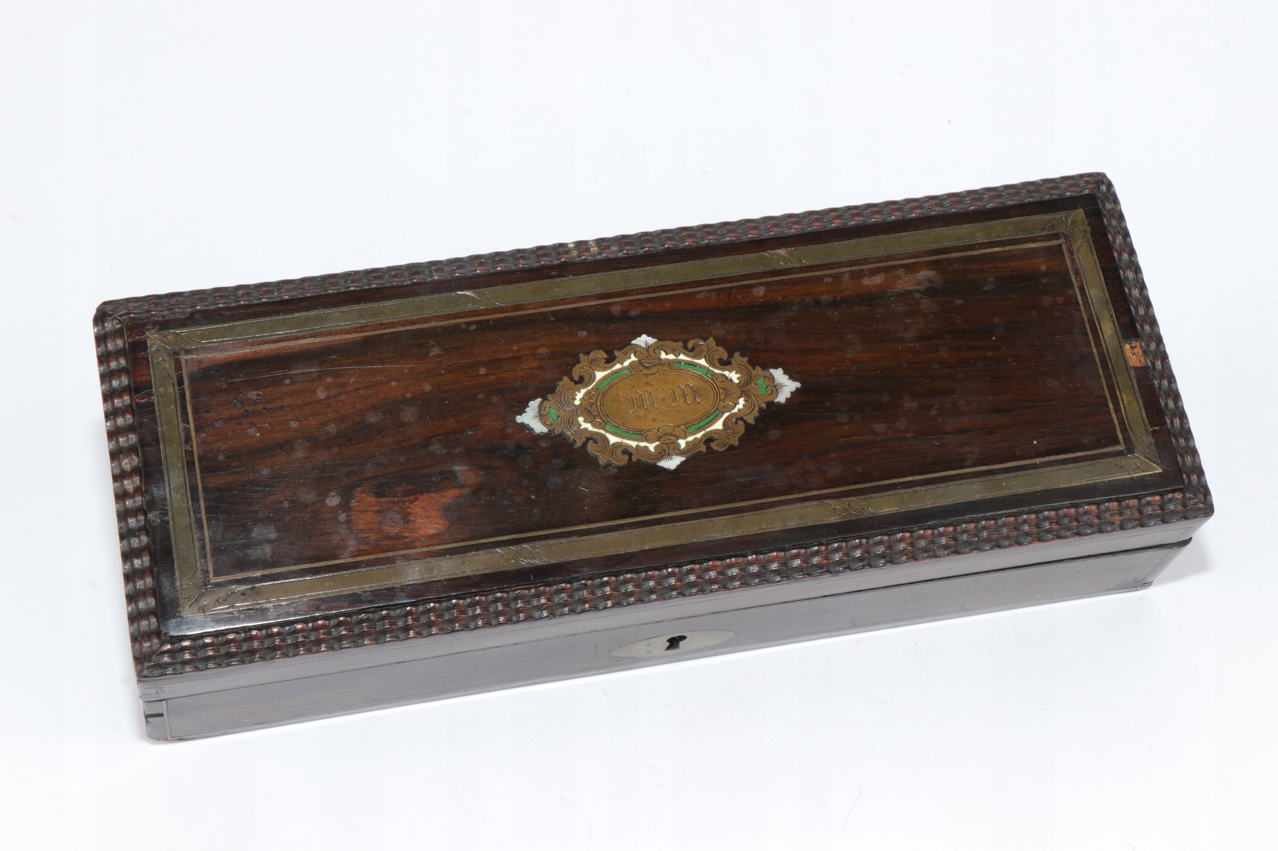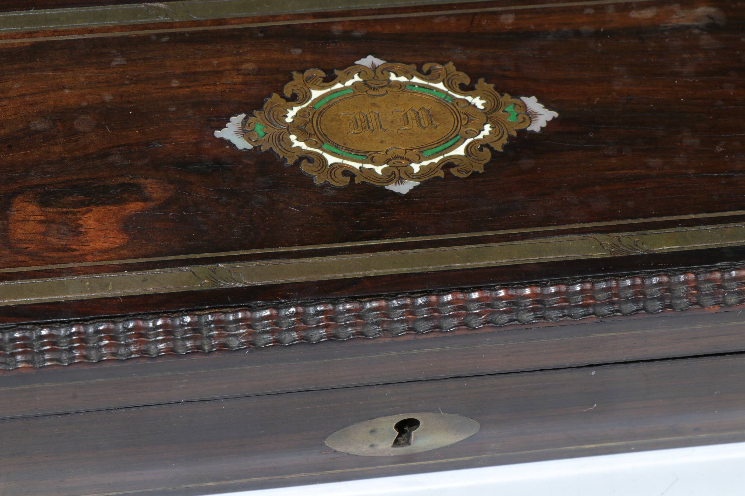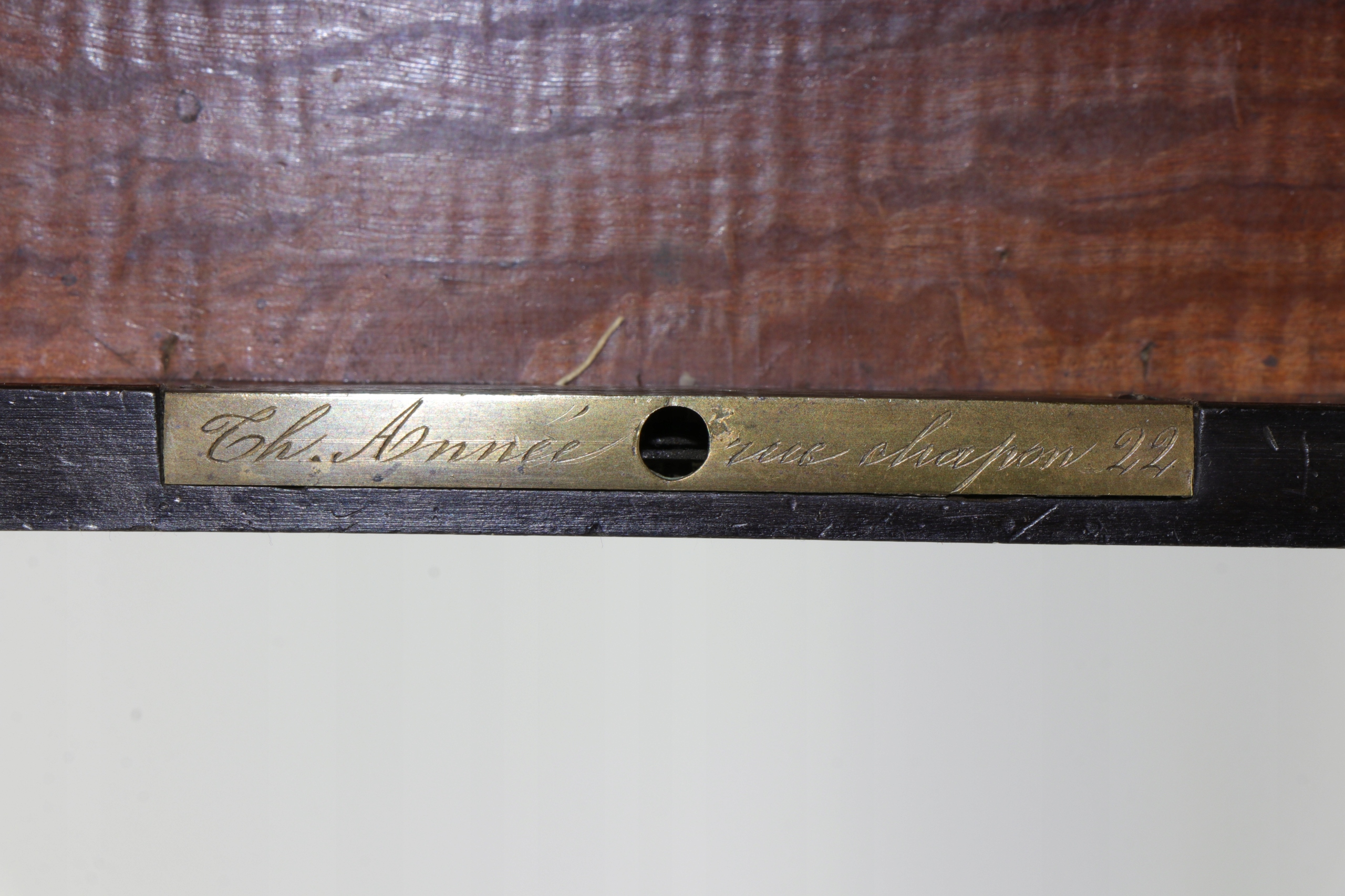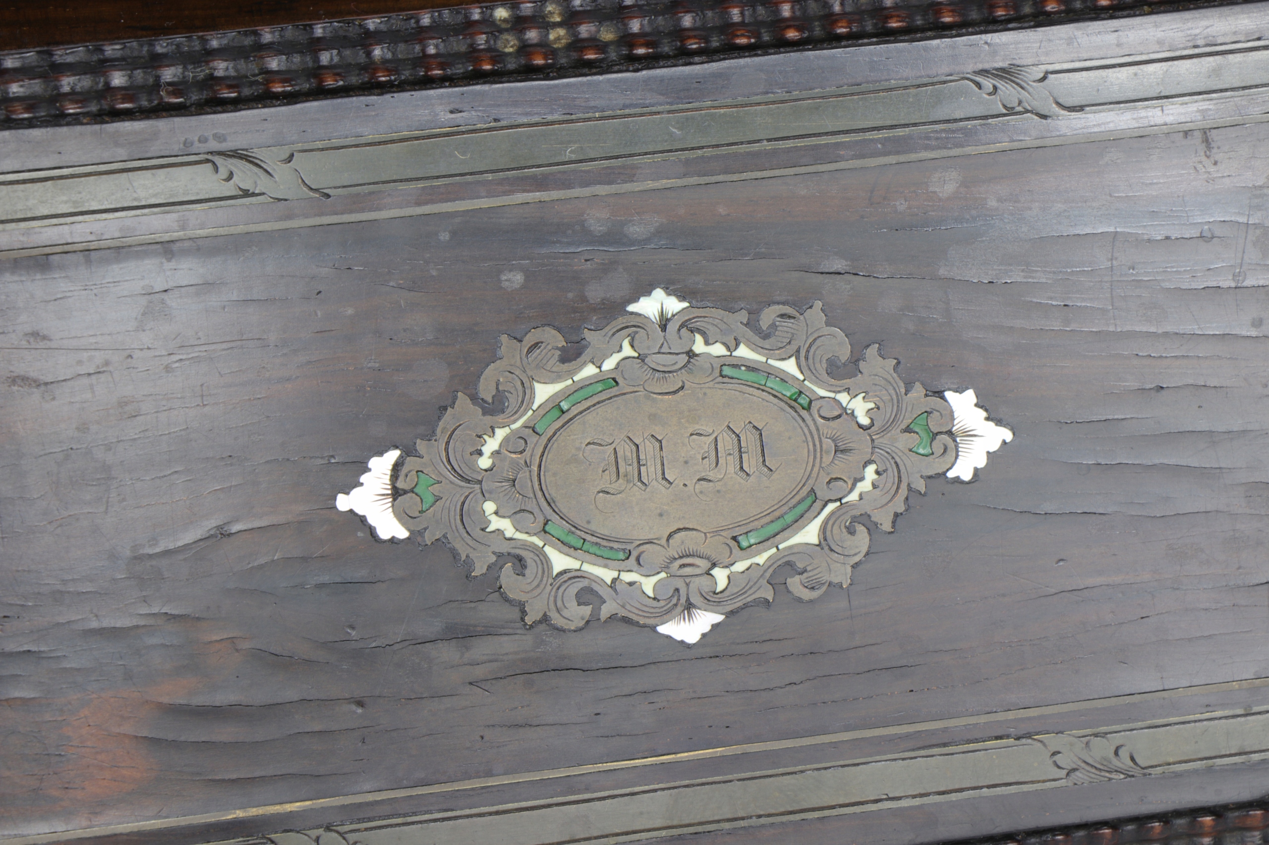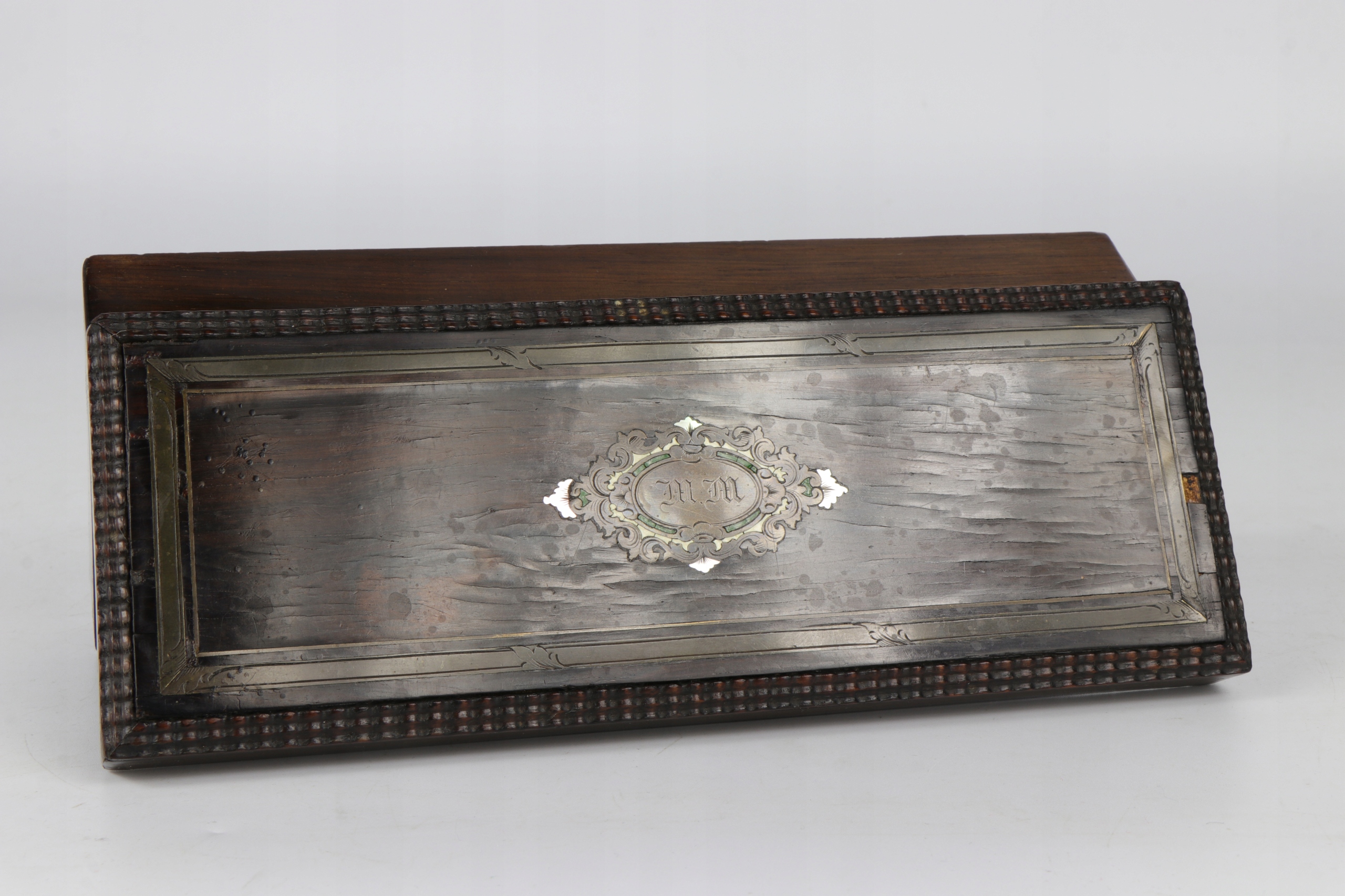 Деревянная коробка, инкрустированная в стиле Боул, закрыта с ключом. Латунная инкрустация в центральной части для возрастных бляшек с монограммой MM, инкрустированной медной и жемчужной маткой. Ящик в интерьере в замке подписал Thnae Rue Champone 22.