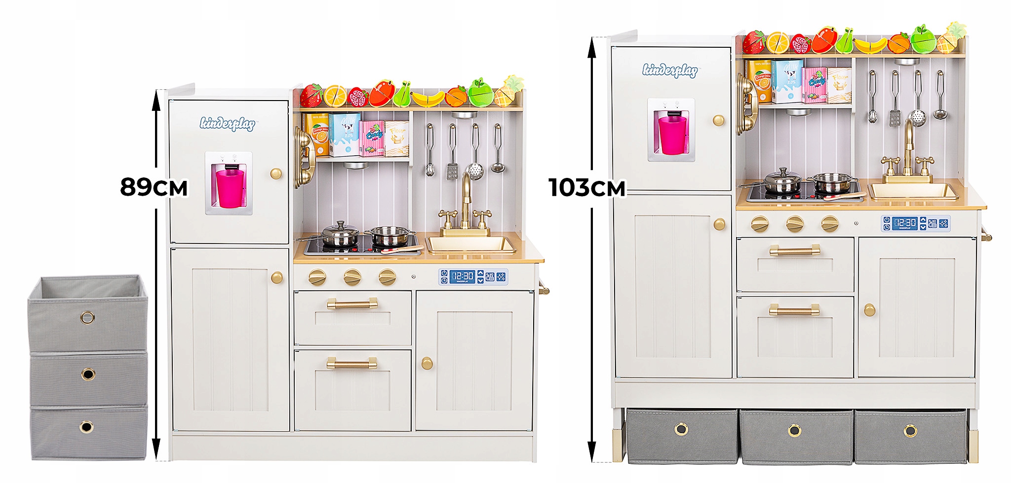 Деревянная кухня Kinderplay в стиле «Винтаж» – это полный набор для маленьких поваров, подражающих шеф-поварам, и мастеров-поваров. Он имеет, среди прочего, индукционная плита, диспенсер для воды, вращающиеся ручки, открывающиеся шкафчики, кран, раковина, духовка, вытяжка, телефон, точечное светодиодное освещение.