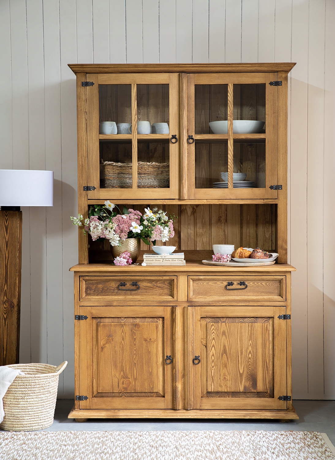 Вощеный деревянный сервант — идеальный предмет мебели для столовой и кухни. Он будет выполнять декоративную и практическую функцию. Благодаря большому пространству в мебели можно хранить любимую дорогую посуду, кружевные салфетки и чашки. Конечно, мебель впечатляет своим неповторимым внешним видом, отсылающим к деревенскому стилю. Таким образом, сосновый буфет идеально сочетается с другой мебелью из коллекции CERA. Поэтому сервант из этой коллекции создает необыкновенную, уютную атмосферу, по стилю напоминающую небольшой домик в горах.