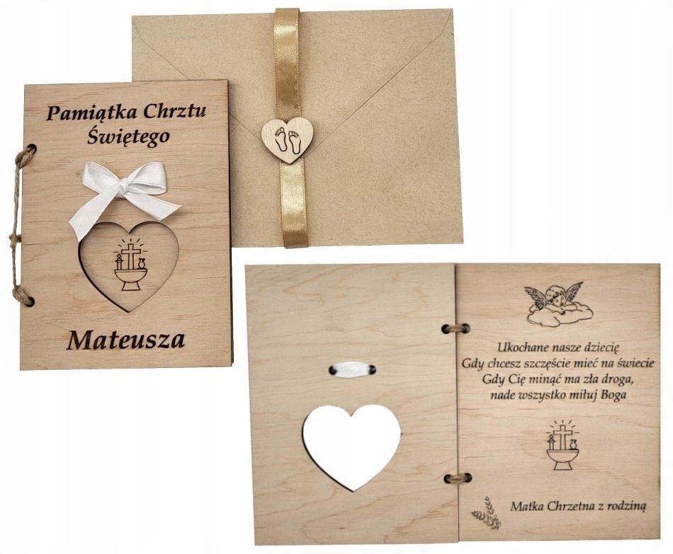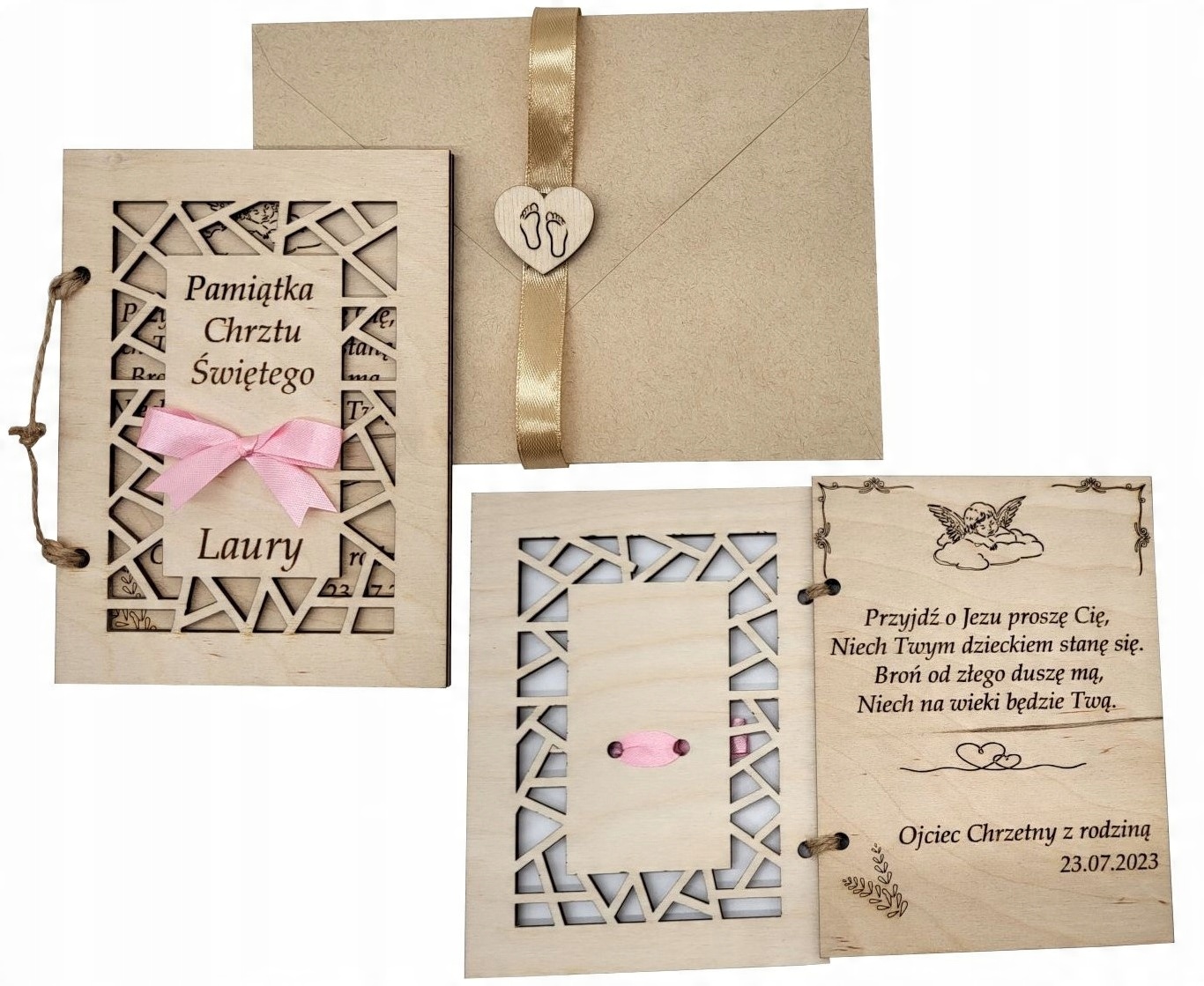 Снаружи выгравирована надпись «Сувенир Святого Крещения» и имя ребенка внизу. Открытка состоит из двух сторон, которые связаны между собой веревкой, что придает элегантность и создает неповторимую атмосферу.