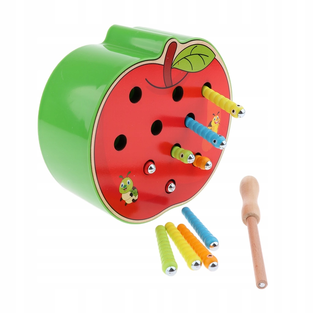 В комплект входит основа в форме яблока с 10 разноцветными гусеницами из дерева и металла и деревянная палочка с магнитом на конце .