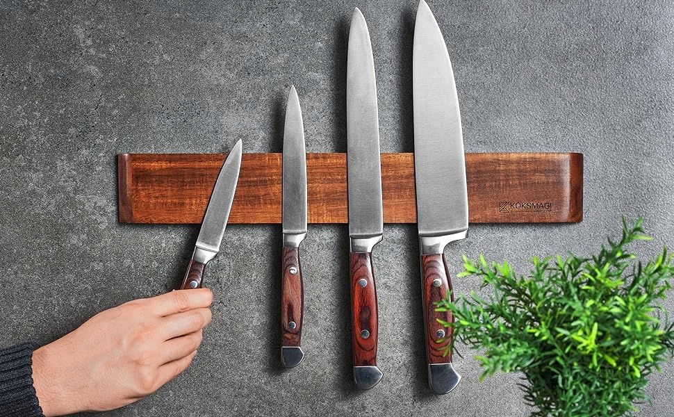 ВЫСОКАЯ БЕЗОПАСНОСТЬ - Очень сильные ферритовые магниты внутри магнитного держателя также безопасно и надежно удерживают особенно тяжелые и большие ножи. Размеры: 50 х 6 х 1,8 см.