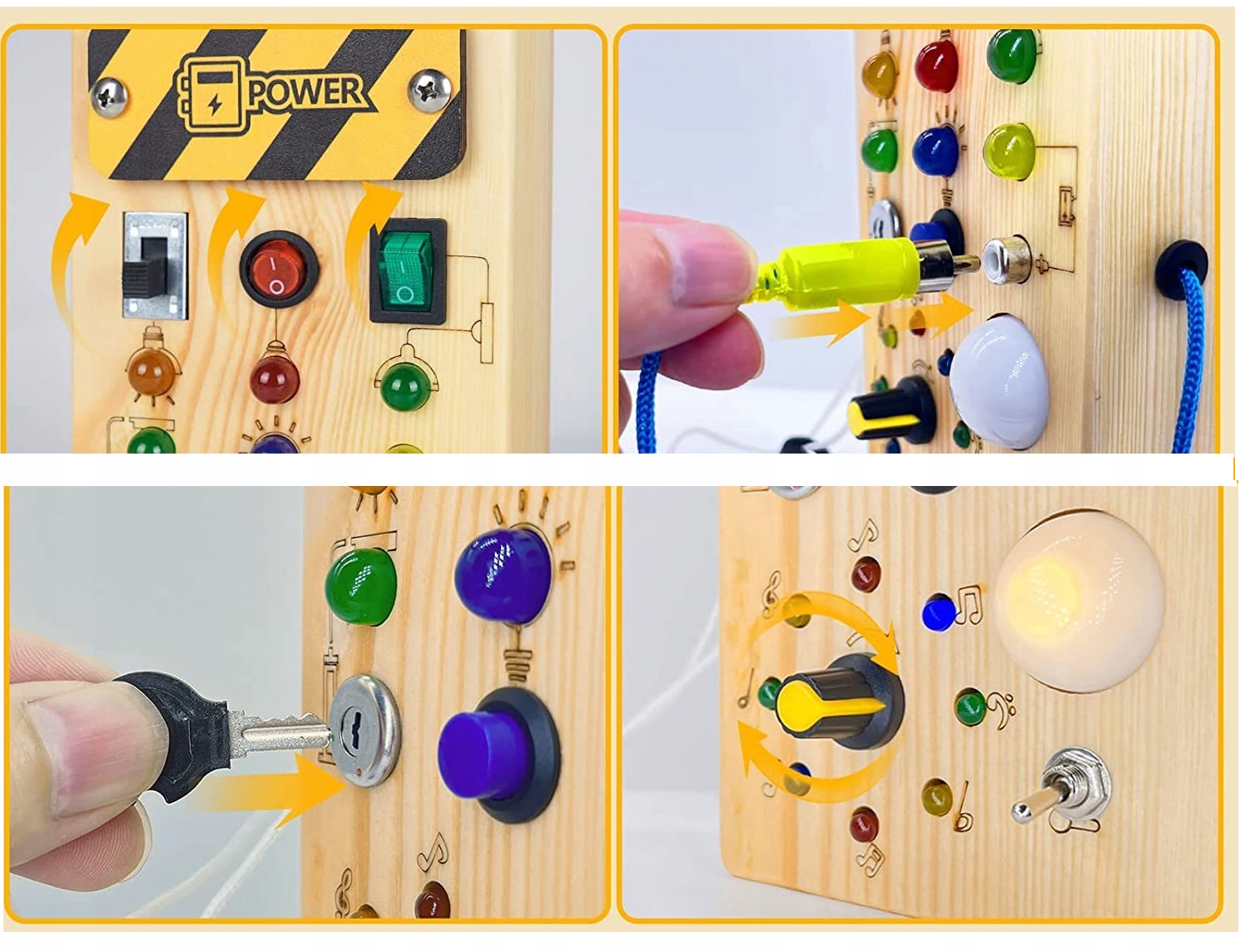 Светодиодные переключатели помогают развивать мануальные навыки и координацию. Каждый переключатель имеет свой рабочий механизм, который способствует развитию мелкой моторики и помогает понять, как работают кнопки и переключатели.