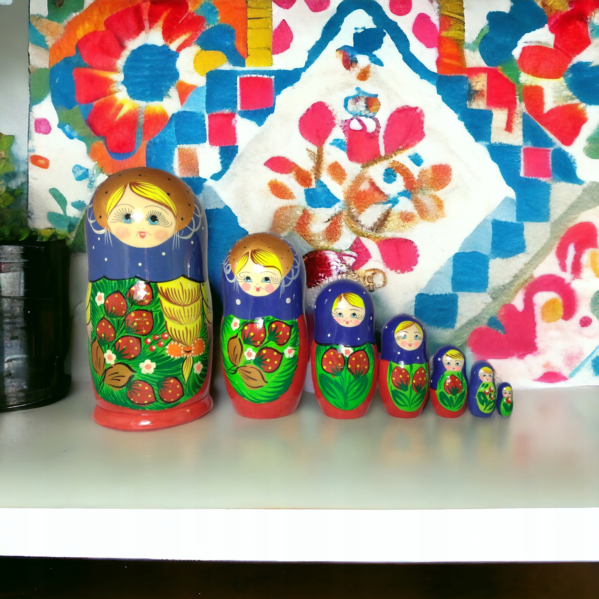 Набор состоит из семи кукол, полых внутри, помещенных одна в другую.