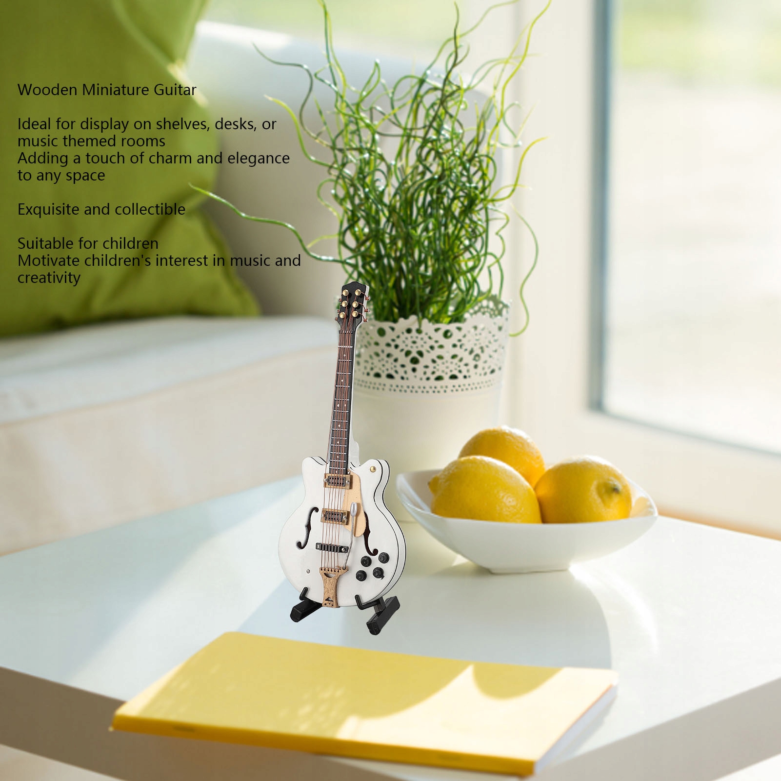 2. Долговечные материалы: украшение миниатюрной гитары изготовлено из высокопрочного древесного материала, прочное и прочное, что обеспечивает долговечность и эстетическую привлекательность.